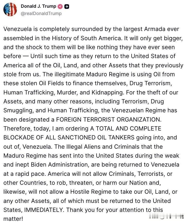 装都不装了,特朗普“额滴额滴都是额滴,石油是额滴,土地也是额滴” 特朗普在社交媒体发文称“委内瑞拉的石油和土地都属于美国”,美国历任总统中特朗普应该是最直白的了。 美国在当年伊拉克战争的时候还拿出一瓶洗衣粉装装样子,现在连装都不装了。