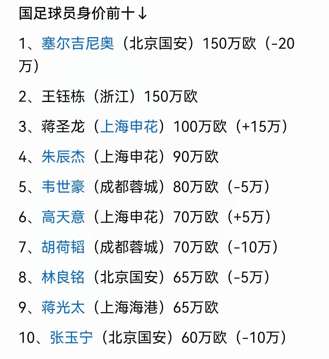 中国国足球员身价普遍下跌,“武球王”武磊更是暴跌到只有50万欧,武磊的时代结束了,江山倍有人才出,王钰栋成了中国球员标王,王钰栋150万欧和归化“塞鸟”并列第一名,前十仅有蒋圣龙和高天意身价上涨,蒋圣龙上涨15万欧到100万欧排第二名,朱辰杰90万欧不变第三名,韦世豪、胡荷韬、林良铭和张玉宁等人身价都下滑了,邵佳一上任,老一批国足队员大概率慢慢退出历史舞台,像王博豪和帅惟浩等新星身价暴涨,中国足球希望犹在,中国足球的希望在未来的新星,中国足球加油!