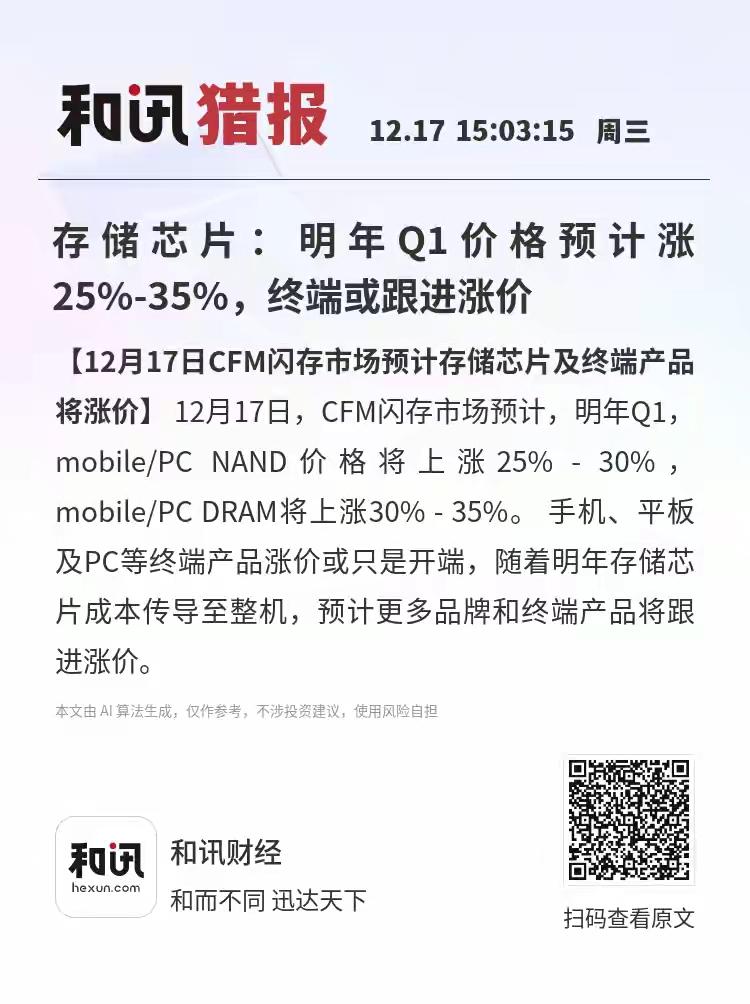 存储芯片:明年Q1价格预计涨25%-35%,终端或跟进涨价 明年的手机,平板,这些PC可能都会涨价!存储芯片依然属于短缺的趋势!涨价潮还要延续,那预计会有更多的品牌或者终端产品都将跟进甚至涨价,国内有些企业已经开始着手准备提价! 那后续还会有更多的存储芯片会被AI人工智能持续发展给吞噬!所以短期内存储芯片依然处于紧缺的状态! 那明年的上半年整个科技行业属于一个上涨的趋势!芯片的需求甚至可能持续到2027年!