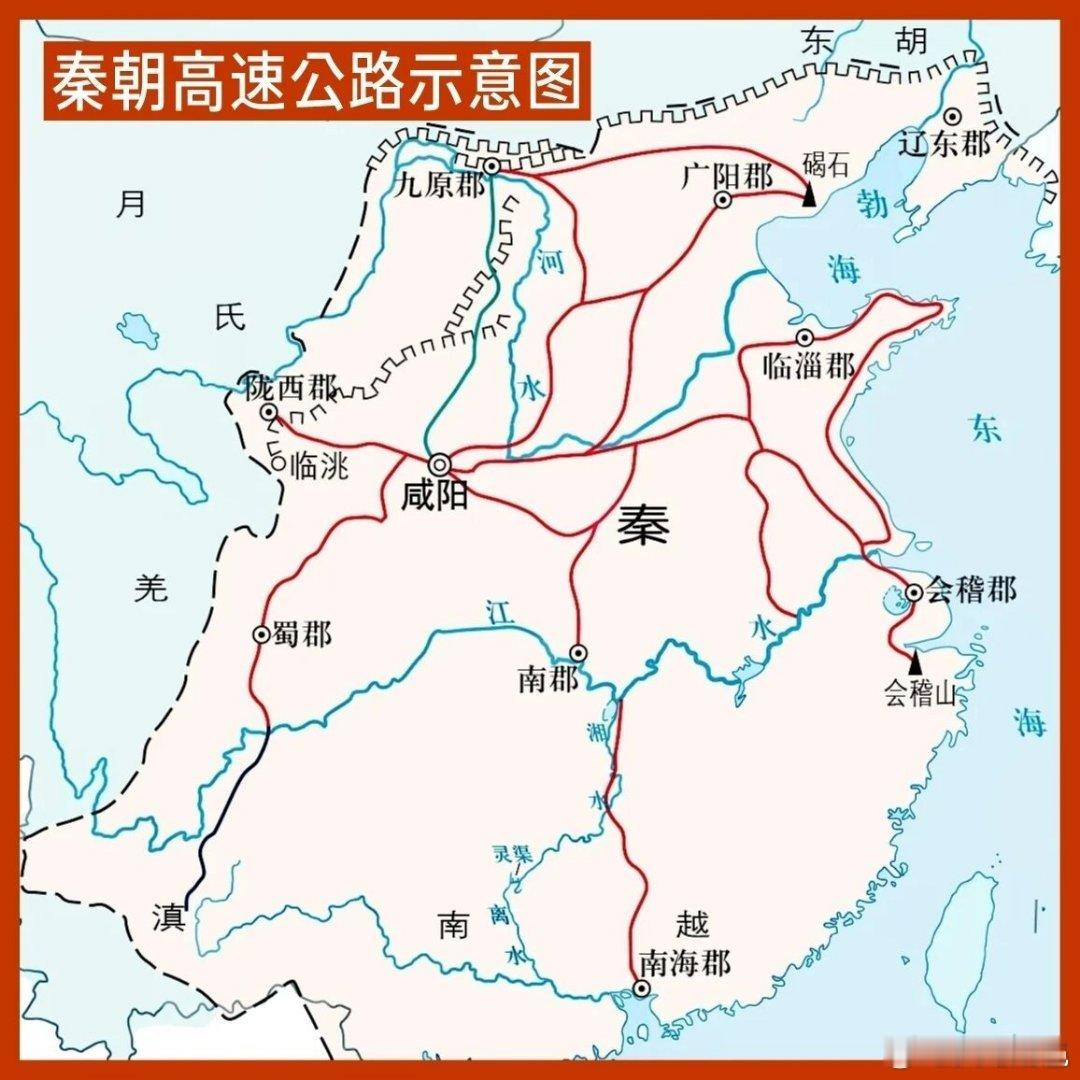 秦朝时期高速公路,秦驰道路线图秦始皇统一中国后,下令以咸阳为中心筑驰道。标准制式为道宽五十步(约69米),每隔三丈(约7米)种植松树,路基用金属椎夯筑加固,中央为皇帝专用通道。秦驰道主要路线如下。东方大道:由咸阳出函谷关,沿黄河经山东定陶、临淄至成山角。川陕大道:由咸阳到巴蜀。秦楚大道:由咸阳经陕西武关、河南南阳至湖北江陵。西北大道:由咸阳至甘肃临洮。北方大道:由九原(今包头)沿长城至河北碣石。秦直道:从云阳(今陕西淳化)至九原。江南新道:南通蜀广、西南达广西桂林。