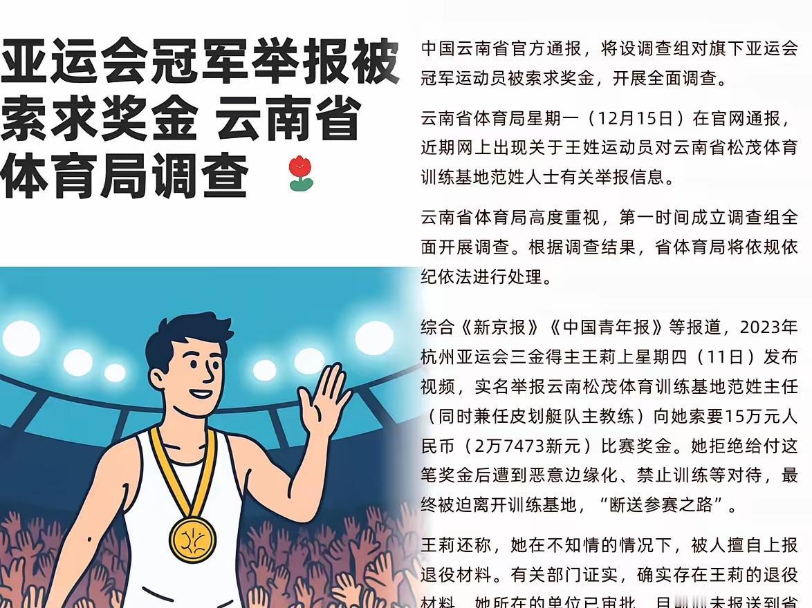 王莉的举报,有了回响:云南体育局迅速做出反应,把高原训练基地的主任范某文先停职了。国家体育总局还派了联合调查组,要求二十天里必须交报告。 这些人胆大妄为,明目张胆的给运动员要奖金、克扣奖金。甚至断送你的参赛之路,直至伪造退役申请,不听话就这样整你。 体育总局让各地自查奖金发放情况,调查结果出来后,就知道具体情况了。运动员人品争议 奥运冠军涉腐 云南体育事业 云南体育局通报 全运会王莉 高原体育中心 王莉老师