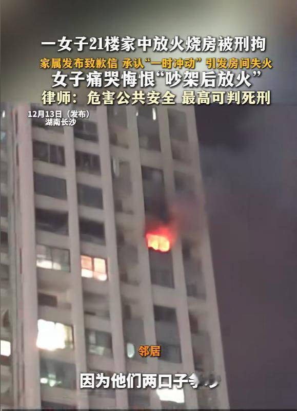 “还敢吵架吗?”近日,湖南长沙,一女子因家庭矛盾,和丈夫吵架之后非常生气,她为了吓唬丈夫,竟跑去卧室故意放火,没成想火势越来越大,将整个卧室烧毁,浓烟弥漫着整栋楼,根本控制不了,引发全楼恐慌。网友:太冲动了! 21楼的楼道里,烟感报警器突然尖锐地响起来时,住在对门的张阿姨正端着菜往餐桌上放。 她以为是哪家做饭忘了关火,推开门想提醒,却看见浓烟像黑色的潮水从隔壁门缝里涌出来,带着呛人的焦糊味。 卧室里,女子攥着打火机的手指还在发抖。半小时前,她和丈夫为了谁该辅导孩子作业吵到摔了碗,那句“你整天在家闲着都做不好这点事”像针一样扎进心里——她觉得自己每天接送孩子、买菜做饭、照顾老人,明明忙得脚不沾地,怎么就成了“闲着”? 怒火上头时,她瞥见床头柜上的打火机,脑子里只有一个念头:让他看看,惹火了她会怎样。 她原本只想烧个小窟窿,等丈夫吓得求饶就赶紧扑灭。可当火苗舔上窗帘的瞬间,她真的想过后果吗? 化纤窗帘遇火就像浇了油,火舌“腾”地窜到天花板,她慌忙抓起床上的被子去捂,被子却跟着烧了起来。浓烟呛得她睁不开眼,想喊人,喉咙里像堵着团棉花。 楼下的住户已经开始拍门了。“谁家着火了?快报警啊!”“我家孩子还在屋里睡觉呢!”嘈杂的人声混着警报声,让她突然清醒——自己闯大祸了。 物业监控室的值班员小李,在屏幕上看到21楼楼道浓烟弥漫时,手指都在抖。他一边按下整栋楼的消防广播,一边抓起电话拨119,嘴里不停念叨“21栋2单元,快!” 消防人员赶到时,整栋楼的居民已经捂着口鼻往下跑。有抱着宠物的阿姨,有背着书包的学生,还有拄着拐杖的老人——大家脸上都是惊慌,没人知道这场火是从“吓唬一下”开始的。 水枪喷了十分钟,卧室里的火才渐渐小下去。床架烧得只剩扭曲的铁条,墙上的结婚照被熏成了黑色剪影,地上的灰烬里,还能看到没烧完的作业本纸角。 女子坐在楼道的台阶上,头发被熏得焦黄,看见警察过来,突然捂着脸哭起来:“我就是想让他哄哄我,我没想烧房子……” 可法律不会因为“没想”就网开一面。律师后来解释,在人员密集的居民楼故意放火,即便没造成人员伤亡,也可能构成“放火罪”,最高可判死刑。 有人可能觉得“夫妻吵架动手动脚常见”,但在每层都住着十几户的居民楼里,卧室不是情绪的“私人战场”,而是连着上下几十户生命安全的“公共区域”。你点的可能是打火机,烧的却是整栋楼的安全感。 她丈夫在派出所签笔录时,手里的笔掉了三次。他说吵架时总觉得“她就是脾气大,过会儿就好了”,却没想过那些积累的委屈,会在某个瞬间变成失控的火种。 现在,女子被刑拘了,孩子暂时由亲戚照顾,家里的房子成了需要重新装修的“灾后现场”。那场吵赢了的架,最终输掉的是一个家的安稳。 其实啊,争吵时摔门而去的力气,本可以用来给对方倒杯热水;说“你从不理解我”的瞬间,若能换成“我今天有点累”,或许就能把怒火掐灭在萌芽里。火能烧毁卧室,却烧不掉生活的难题,真正能灭火的,从来不是后悔的眼泪,而是冷静下来的那句“我们好好说”。