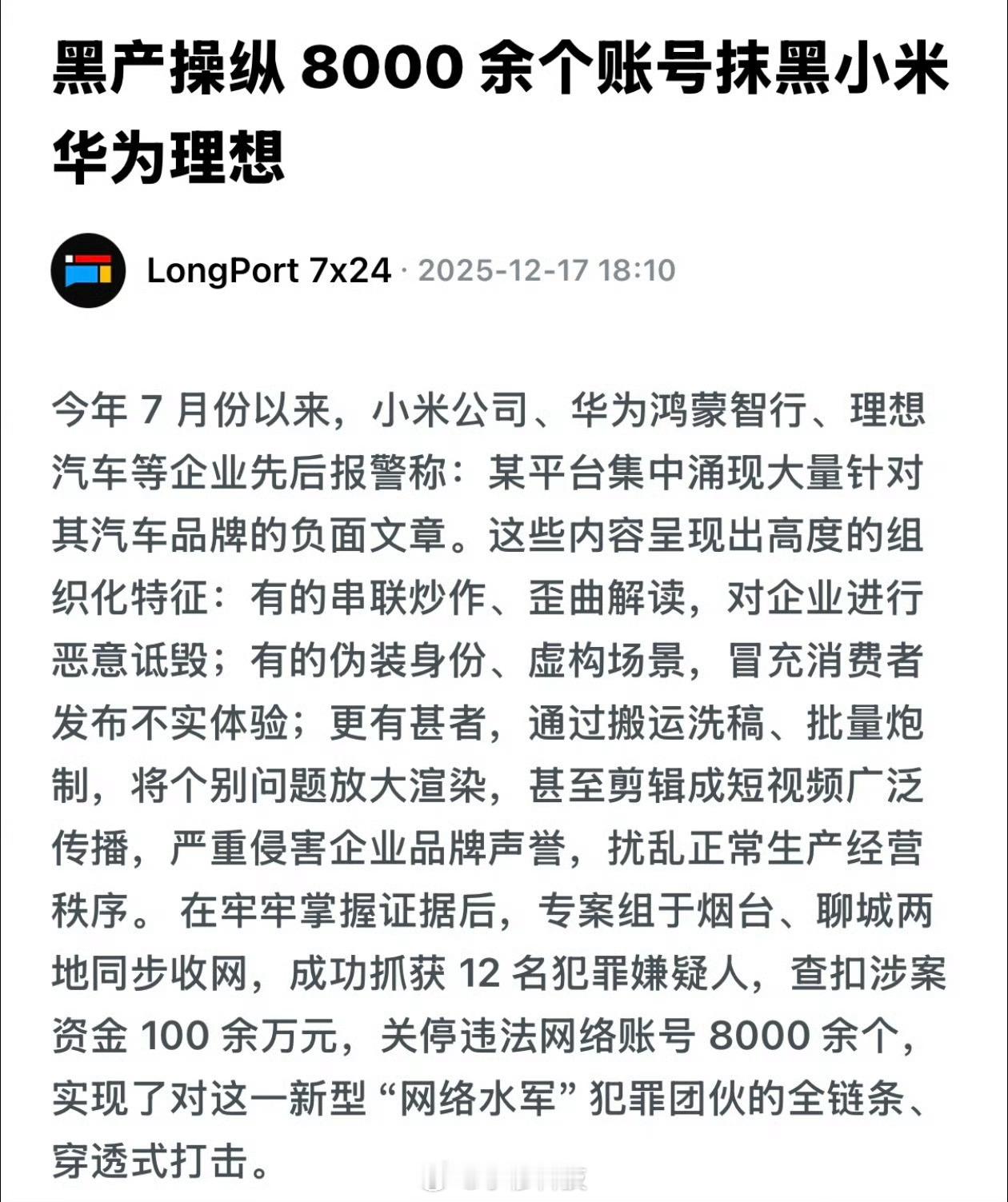黑产操纵8000余个账号抹黑小米华为理想黑产业操纵8000多账号,专门黑华为理想小米来获利,所以那些天天网上说黑自己的是友商的尴尬了,其实友商也是受害者,不过网上带节奏的博主基本都封禁了黑产操纵8000余个账号抹黑小米华为理想
