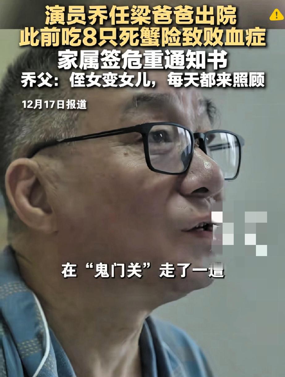 “舍不得扔”差点要命! 乔任梁爸爸康复出院的消息让人松口气,但这场因8只死蟹引发的生死劫,真该让每个家庭警醒。 存放三天的死蟹,明知眼珠都不动了还舍不得丢,吃完直接高烧41℃、被下危重通知书,这哪里是节约,分明是拿健康赌侥幸。 老一辈的惜物观念能理解,但食品安全面前,“该扔就扔”才是真明智,省小钱花大钱治疗的教训太深刻。 死蟹滋生细菌、产生毒素的速度远超想象,哪怕高温蒸煮也难完全消除,这不是危言耸听。 乔爸爸说“对螃蟹有心理阴影”,这代价换来得太沉重。 真正的珍惜从不是硬吃不新鲜的食材,而是守住餐桌安全底线。 你家老人也有这种“舍不得扔”的习惯吗?怎么劝说才管用?