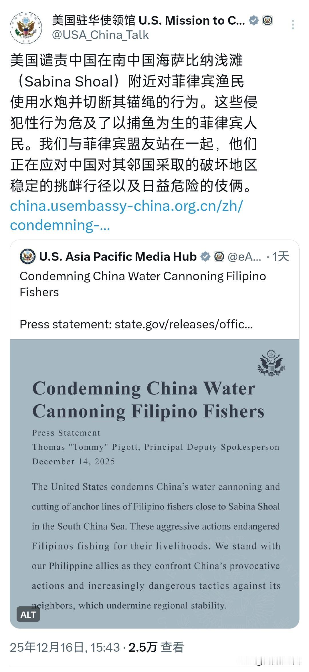 美国驻华使领馆12月16日发文写道:美国谴责中国在南中国海萨比纳浅滩附近对菲律宾渔民使用水炮并切断其锚绳的行为。这些侵犯性行为危及了以捕鱼为生的菲律宾人民。我们与菲律宾盟友站在一起,他们正在应对中国对其邻国采取的破坏地区稳定的挑衅行径以及日益危险的伎俩。 12月16日,美国驻华使领馆一则发文直接搅动了南海局势的平静。文中不仅指名道姓谴责中国在南中国海萨比纳浅滩附近,对菲律宾渔民采取了用水炮驱离、切断锚绳的行为,还直言这些举动是“侵犯性”的,危及了菲律宾渔民的生计, 甚至表态会和菲律宾盟友站在一起,指责中方的行为“破坏地区稳定”“手段日益危险”。这番单方面的指责看似义正辞严,可结合南海问题的来龙去脉和过往事实来看,里面的漏洞实在太多。 首先得明确一个核心事实,萨比纳浅滩所在的南海相关海域,自古以来就是中国的固有领土和传统渔场,中国对这片海域拥有无可争辩的主权。 这一点不仅有历史文献和法理依据支撑,在国际社会也有着广泛共识。中国海警在相关海域开展执法活动,本质上就是在维护国家主权和海洋权益,也是在规范渔业生产秩序,避免出现非法捕捞等破坏海洋生态的行为。 熟悉南海局势的人都清楚,类似的海上摩擦并非首次出现,而背后的根源往往是菲方渔船的非法侵闯。就在今年8月,菲律宾就曾派多艘海警船、公务船以及所谓的渔船,擅自侵闯黄岩岛领海, 甚至出动军机侵入相关空域,中方当时依法采取必要措施进行驱离,事后外交部也明确表态,菲方的蓄意侵权挑衅才是导致局势紧张的根本原因。此次萨比纳浅滩附近的事件,大概率也是菲方渔船先违反相关规定,中方才采取了合理合法的管控措施。 美国驻华使领馆在发文时,刻意忽略了菲方可能存在的非法侵闯前提,直接将矛头对准中方,这种选择性失明的做法实在难以服众。 更值得玩味的是,美国作为一个远在美洲的国家,本身并不是南海问题的直接相关方,却屡屡在这个问题上指手画脚,甚至频繁动用军事力量在南海开展抵近侦察、联合军演等活动,这些行为才是真正破坏地区和平稳定的根源。 这些年美国在南海的操作可谓套路满满,一边打着“维护航行自由”的旗号,不断向盟友出售武器,鼓噪地区对抗;一边又对自己盟友的非法行为视而不见,反而对中方的合法执法横加指责。 就拿菲律宾来说,美国为了巩固自身在亚太地区的影响力,不断强化与菲律宾的军事同盟关系,不仅增加驻军规模,还协助其提升军事装备水平,这无疑是在给南海局势火上浇油。 从法律层面来看,中国海警的执法行为完全有法可依。依据《中华人民共和国海警法》等相关法规,中国海警有权对非法侵入中国海域的外国船只采取登临检查、驱离等管制措施,这是主权国家的正当权利。 反观美国,在国际事务中向来奉行双重标准,自己在全球各地发动战争、干涉他国内政时毫无顾忌,却对其他国家的合法维权行为说三道四,这种霸权逻辑早就被国际社会所诟病。 国际社会对南海问题的态度其实很明确,绝大多数国家都主张通过和平谈判、协商对话的方式解决分歧,反对外部势力介入和干涉。 美国此次公然为菲律宾“站台”,看似是在维护盟友利益,实则是想借南海问题牵制中国发展,打乱地区和平发展的节奏。这种出于自身霸权私利的操作,只会让南海局势变得更加复杂,也会损害美国自身的国际信誉。 事实上,中国一直致力于同直接有关的主权国家,通过谈判协商和平解决南海争议,同时积极维护南海的和平稳定和航行自由。这些年中方提出的“双轨思路”,得到了越来越多东盟国家和国际社会的认同和支持。 反观美国,除了指责和挑衅,从未提出过任何切实可行的解决方案,这种只破不立的做法,根本不利于南海问题的解决。 对此,你们有什么看法,欢迎评论留言~