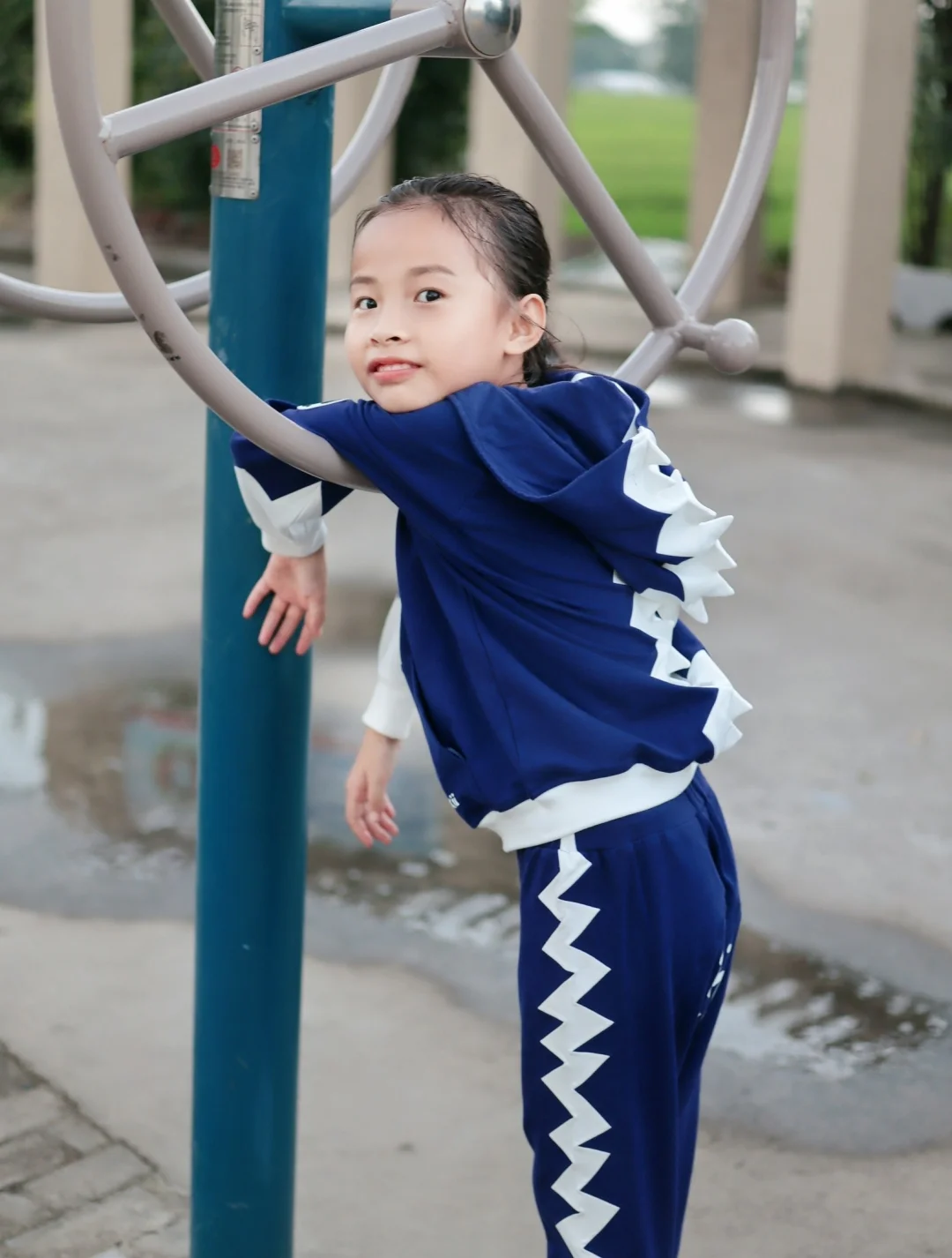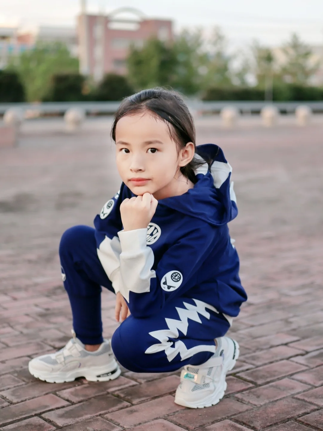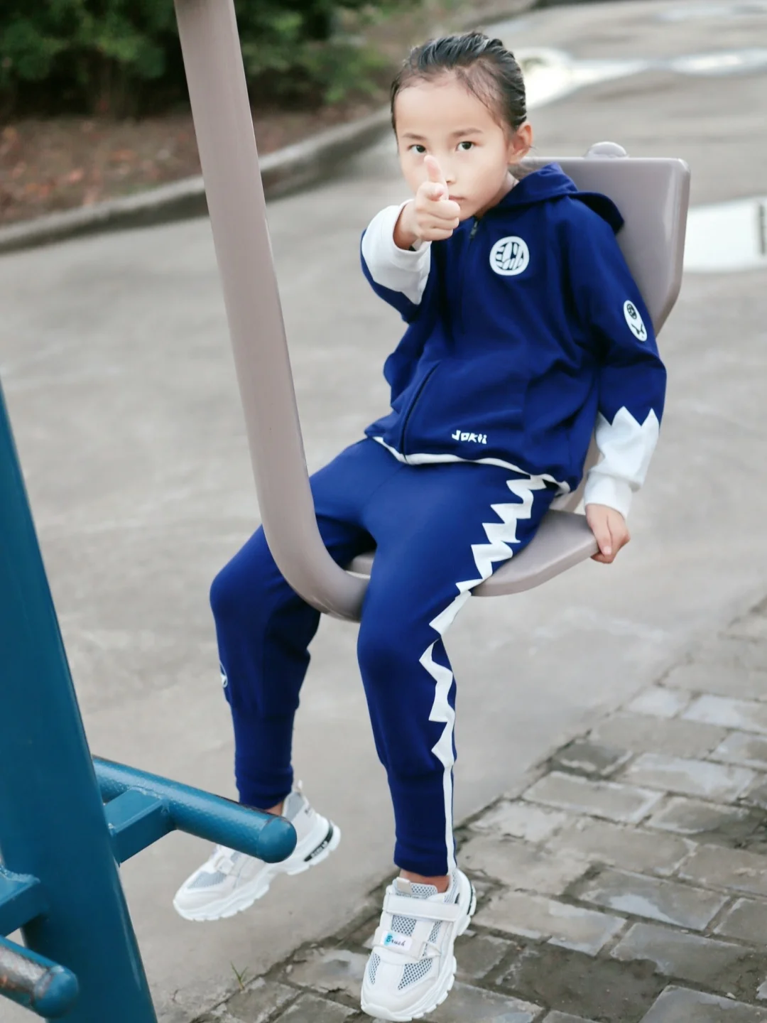 姐姐性格比较内向点 是个不爱笑 但是却很温暖的女孩👧 会宠着让着妹妹 就连我的小情绪爱好都会顾及到❤️ 小女孩也爱美 平时爱穿甜美可爱的裙子👗 有时候出去玩或者体育课什么的 还是穿休闲运动装更方便 近期给她新入手了 一套潮牌套装和运动鞋😍 穿上身 so cool 裤子是收腿版型 她比较瘦超适合 连帽小恐龙的设计 没有小孩子不爱吧😬 面料舒适动起来也不会勒 特意搭配了一双白色运动鞋 透气舒适又防滑 一整套吸👀指数up up “燃爆街头”so eazy✌✌ . 套装:Jokii 童鞋: