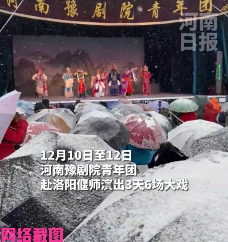河南偃师有豫剧团雪中演出不散场。 在豫剧团的演出过程里突然天落雪花,但现场没有人离开也没有演员散场,台下观众撑伞观看,台上演员还在卖力演绎剧目情节,这里写照出戏比天大的老传统,一旦开戏演完为止。 这里看到当地文化的特色,一方水土赋予的地方情缘,这里演出是世代的生活味道,在岁月中沉淀出的芬芳是百年韵味,无论是演员还是观众都在这样的生活意味中生活,体会到其中有过的共鸣,这不仅仅是戏,还是众人眼里生活的味道。 如今虽娱乐活动多了,我们对于传统的文化有了选择,其实这里看到还是有很多的观众,痴迷一些传统的剧目,得以让这些传统文化传承赓续,这里有老观众的执着偏爱,也有小观众的惊奇与兴趣,这就是传统文化的魅力,一直如此的吸引众人,得以发扬光大。 河南偃师雪中听戏看戏一幕令人感喟,依旧见传统豫剧如同夜空中最亮的星,雪中最为漂亮的景,让人无法抗拒这一笑倾城,甘愿为之沉醉。