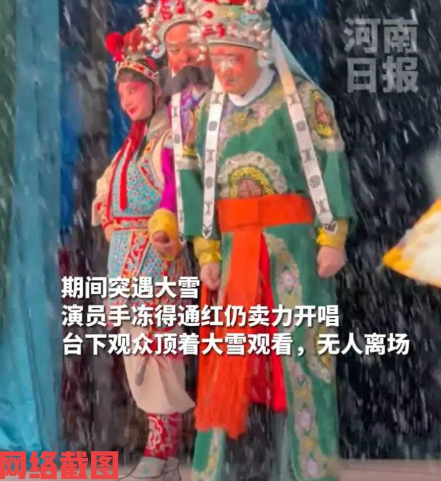 河南偃师有豫剧团雪中演出不散场。 在豫剧团的演出过程里突然天落雪花,但现场没有