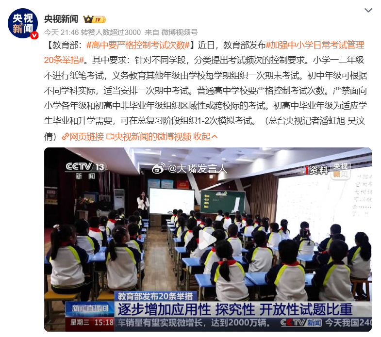 高中要严格控制考试次数 小学一二年级不进行纸笔考试学知识,如果不动手演练习题、不背诵内容、不做些题实践定义、不做题进行抽象思维训练,那些知识能跑进脑子里吗?我问过孩子,你什么时候最快乐?孩子说,不上学、出去玩最快乐你告诉我,背诵九九乘法表,怎么快乐地、无痛记忆?加强中小学日常考试管理20条举措,热点观点