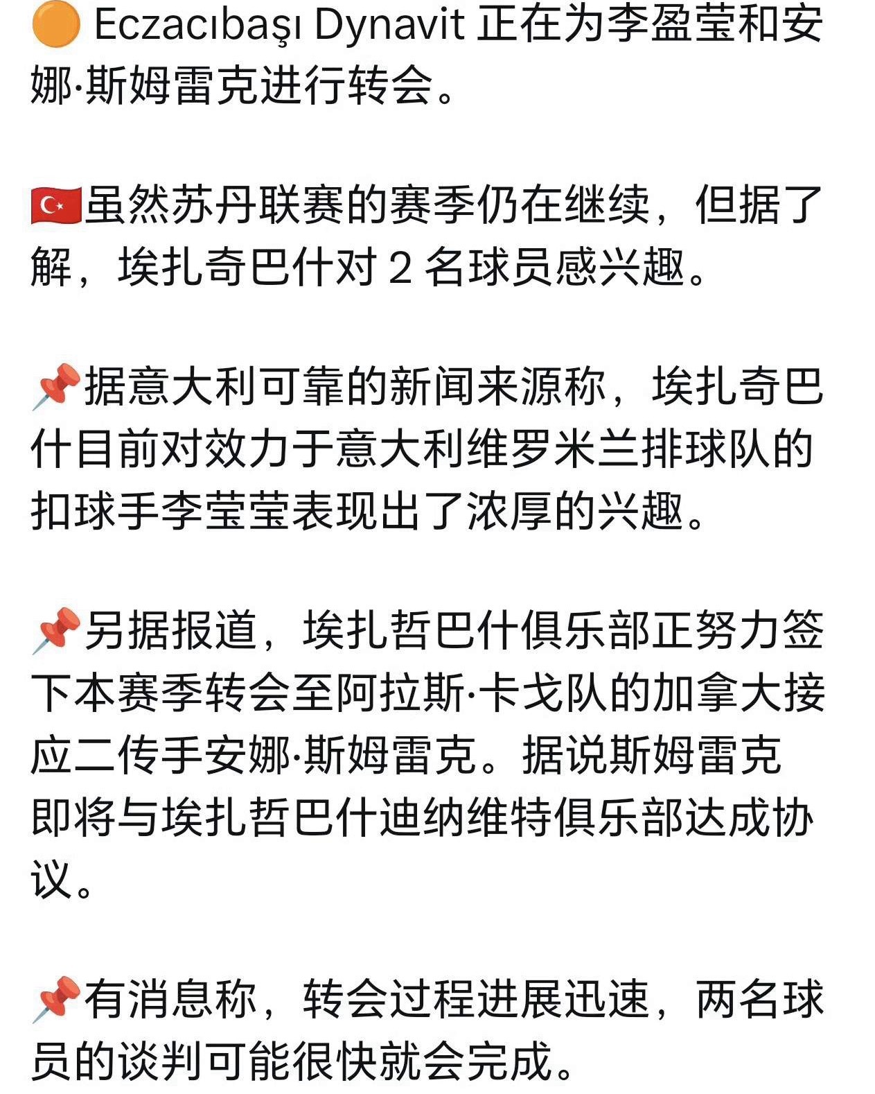 李盈莹要转会到土耳其伊萨奇巴希俱乐部吗?距离李盈莹去意大利米兰已经有17天了,至今还没有看到李盈莹签约米兰俱乐部的消息,也没有李盈莹通过体检的消息!网上又流传出土耳其豪门俱乐部伊萨奇巴希要跟着米兰抢李盈莹,说是要跟李盈莹签约这个赛季的后半段,感觉这是在跟意大利米兰俱乐部施加压力啊!米兰俱乐部到底什么情况,到底跟妹妹李盈莹签约成功了不,也不给个确切消息!