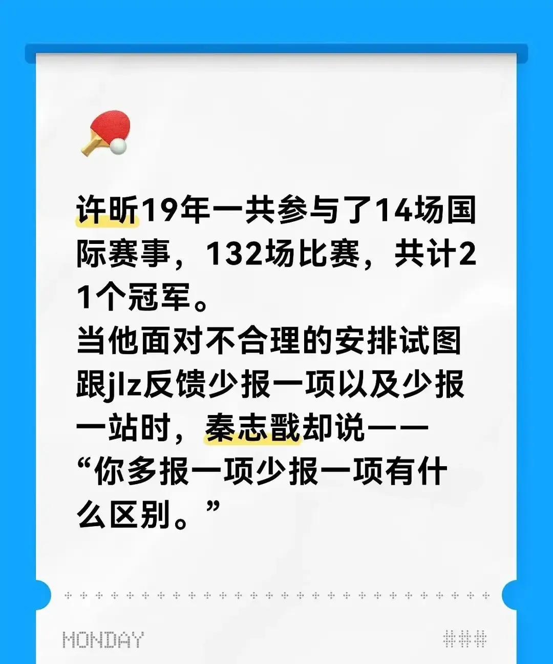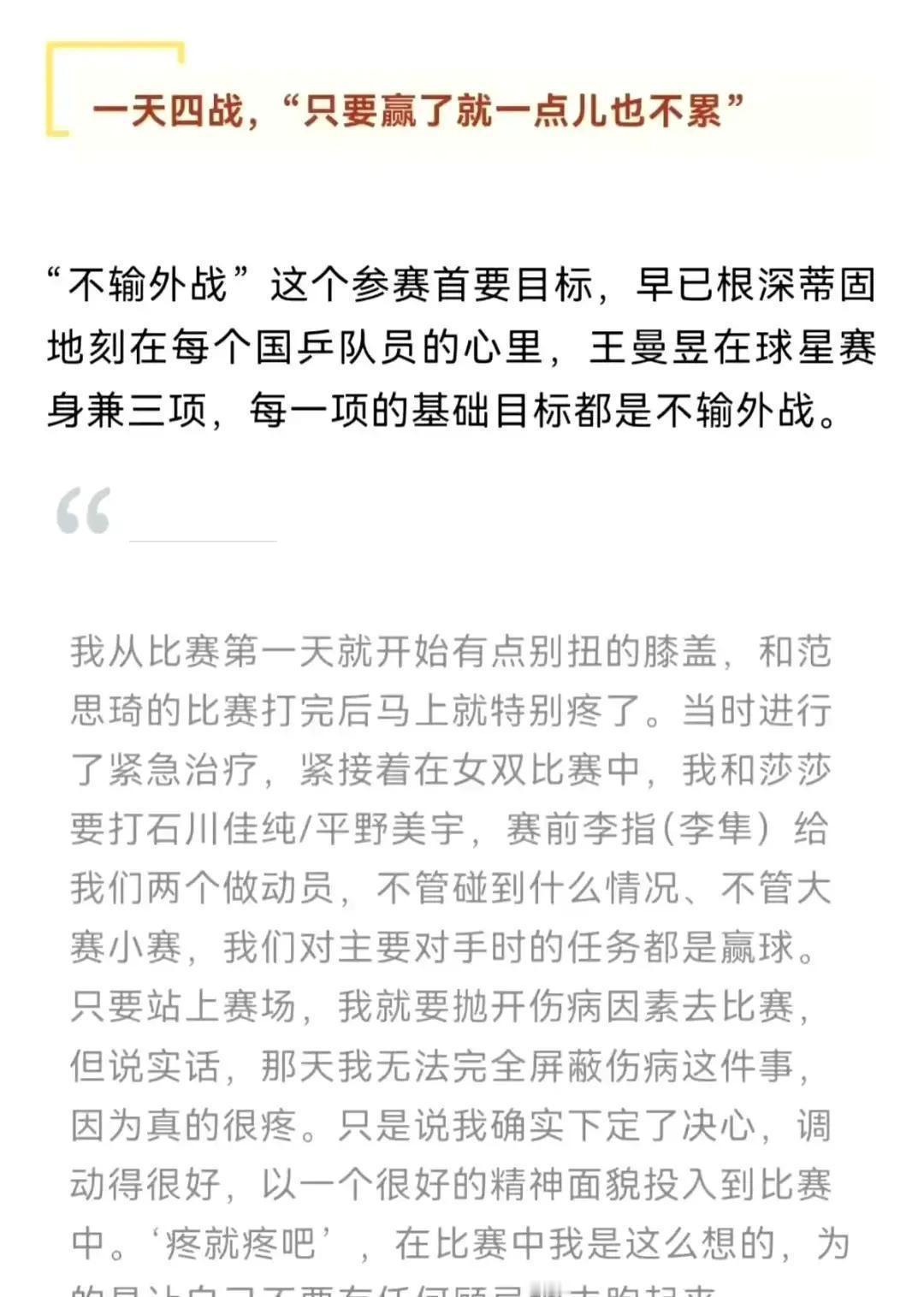 乒乓球队这些事得说道说道。你看许昕,一年打一百多场比赛,铁人也得累趴下。王曼昱带着伤硬扛,刘诗雯那会儿也是,伤情都给耽误了。表面风光,背后全是咬牙坚持。 为啥这么拼?名额就那几个,不玩命打积分,机会就没了。队里要成绩,个人要未来,矛盾就在这儿。国际乒联现在把强制比赛减到了8站,还能申请伤退,这是进步。咱们自己也搞了健康档案,不舒服三天就得上报。 但光靠规定不够。马龙去年就聪明,混双不打了,专攻单打,结果冠军拿着,身体也没垮。这思路对,得学会取舍。现在还有负荷监控设备,德国队一人配一个理疗师,这些好办法咱得跟上。 说到底,运动员不是耗材。他们的运动寿命和长期健康,比一两块金牌更金贵。梯队建设得扎实,让后面的队员能顶上,前面的主力才能喘口气。听说江苏在试运动员终身医保,这事儿干得实在。 成绩要争,但人更重要。别让拼命三郎的故事,总以伤病作为结局。科学安排,长远眼光,这才是真正的强大。