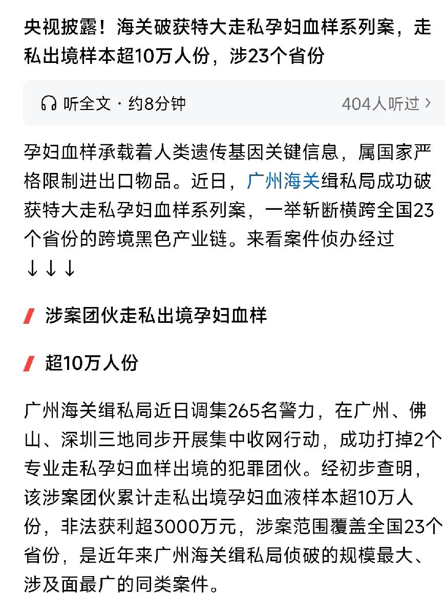 海关查获走私中国人血液样本10万余份,走私分子已获利3000万元。 这可不是小打小闹的走私生意,而是一条分工明确、运作成熟的“网络招揽-快递集样-中转储存-跨境走私”完整产业链,每个环节都有专人负责,隐蔽性强到让人咋舌。 走私团伙先是在社交平台上打着“无创胎儿性别鉴定”“精准遗传病筛查”的旗号发广告,用“安全无风险”的话术吸引孕妇扫码添加好友,把胎儿孕周等信息传给境外化验所确认后,就以两千到三千元的价格接单。 孕妇按要求找“熟人”或网络医疗平台采完血,通过快递寄到指定地址,专门的人员接收集中后,再交给水客通过特殊方式走私出境。 这些水客为了躲过关口检查,花样百出,把装着血样的试管用胶带绑在腹部、大腿内侧,或是藏进特制夹层的拉杆箱,甚至有人把血样塞进茶叶盒、玩具里蒙混过关。 今年8月就有一名水客神色慌张过关被拦下,当场查出537人份的孕妇血样,而核心水客头目卓某在2024年4月到2025年8月这一年多里,就组织走私了4000多人份血样。 团伙头目李某更是嚣张,租下创意园区伪装成传媒公司,内部把业务、仓储、物流环节故意切割,相关人员互不联系,就算之前因走私血样被打击过,依旧贼心不死。 案发前两天还带着护照、外币准备潜逃,好在被警方及时截获,他短短五个月就靠这门勾当获利700多万元,水客头目卓某也赚了十几万元。 这些被走私的血液样本可不是普通的液体,里面藏着中国人的遗传基因密码,属于国家严格限制进出口的人类遗传资源,出境必须经过专门审批。 但走私团伙完全不管这些规定,血样在运输、储存过程中根本达不到国家规定的温度和管控要求,案件中多次出现血样渗漏、试管破损的情况,更让人揪心的是,部分血样还含有传染性疾病,就像流动的生物炸弹,随时可能引发疫病传播。 而更严重的是基因信息的流失,10万人份的样本涵盖了不同地区、不同背景的中国人基因特征,一旦被境外机构大量搜集分析,就能摸清特定人群的遗传规律和易感疾病等关键信息。 早有迹象表明,境外一些组织和机构一直在处心积虑搜集中国人的基因资源。 五角大楼在上世纪90年代初就制定了针对特定人种的基因武器研发计划,华人基因被明确列入搜集范围。 美国辉瑞、艾伯维等生物科技巨头,也曾以招募药物试验志愿者为名,专门筛选祖上三代都是纯种中国人的参与者,报销差旅费用只为采集基因样本。 还有美国公司曾以研究慢性病为名,与国内机构合作,采集了50万人的血样和体检数据,国内合作方甚至不清楚这些数据的最终去向。 更有甚者,国内某药企曾试图将5000多份生物遗传样本伪装成“犬血浆”偷渡出境,这些案例都说明,境外对中国人基因资源的觊觎从来就没停止过。 基因信息关乎每个人的健康隐私,更关乎国家生物安全,大量中国人的基因样本被走私出境,一旦被恶意利用,可能研发出针对特定人群的生物制剂,给公共健康带来长期隐患。 而走私分子之所以敢铤而走险,核心就是巨额利润的诱惑,一份血样就能赚数百上千元,短短几个月就能获利数百万,这种高回报让他们把法律和国家利益抛到脑后。 这些走私分子眼里只有钞票,把同胞的基因密码当成赚钱筹码,完全不顾及疫病传播的风险,更不在乎给国家生物安全埋下的雷。 他们赚的每一分钱都沾着风险,不仅坑了那些被蒙骗的孕妇家庭,更损害了整个国家的集体利益。 这种出卖民族利益的勾当,绝不能轻饶,要是只给个不痛不痒的处罚,根本挡不住其他人铤而走险。 必须从全链条加大打击力度,不仅要严惩走私团伙骨干,追缴全部非法所得,还要堵住监管漏洞,让快递验视更严格、口岸排查更精准,同时让公众看清境外检测的风险,选择正规医疗渠道,才能彻底斩断这条黑色产业链。