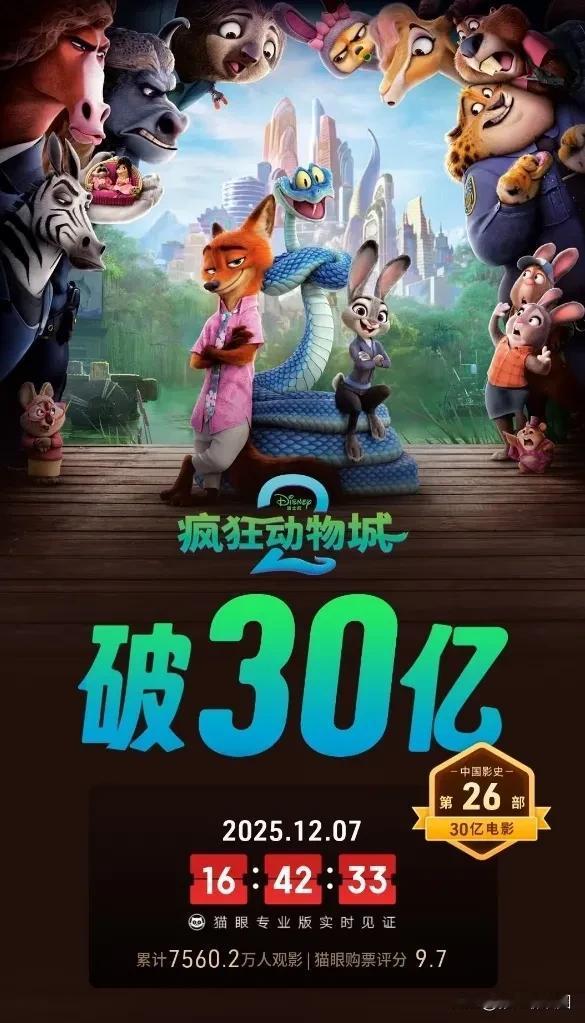 《疯狂动物城2》破30亿了,真的了不起。这次真太猛了,国内在那么冷的大档期,能上30亿。主力军还是年轻人为主,年轻人来看此片的比小孩子还多。大多人喜欢动物们,是因为纯粹简单,有趣可爱。高压生活中能给人们带来减压,轻松愉快心情,由此也能理解票房高的原因。