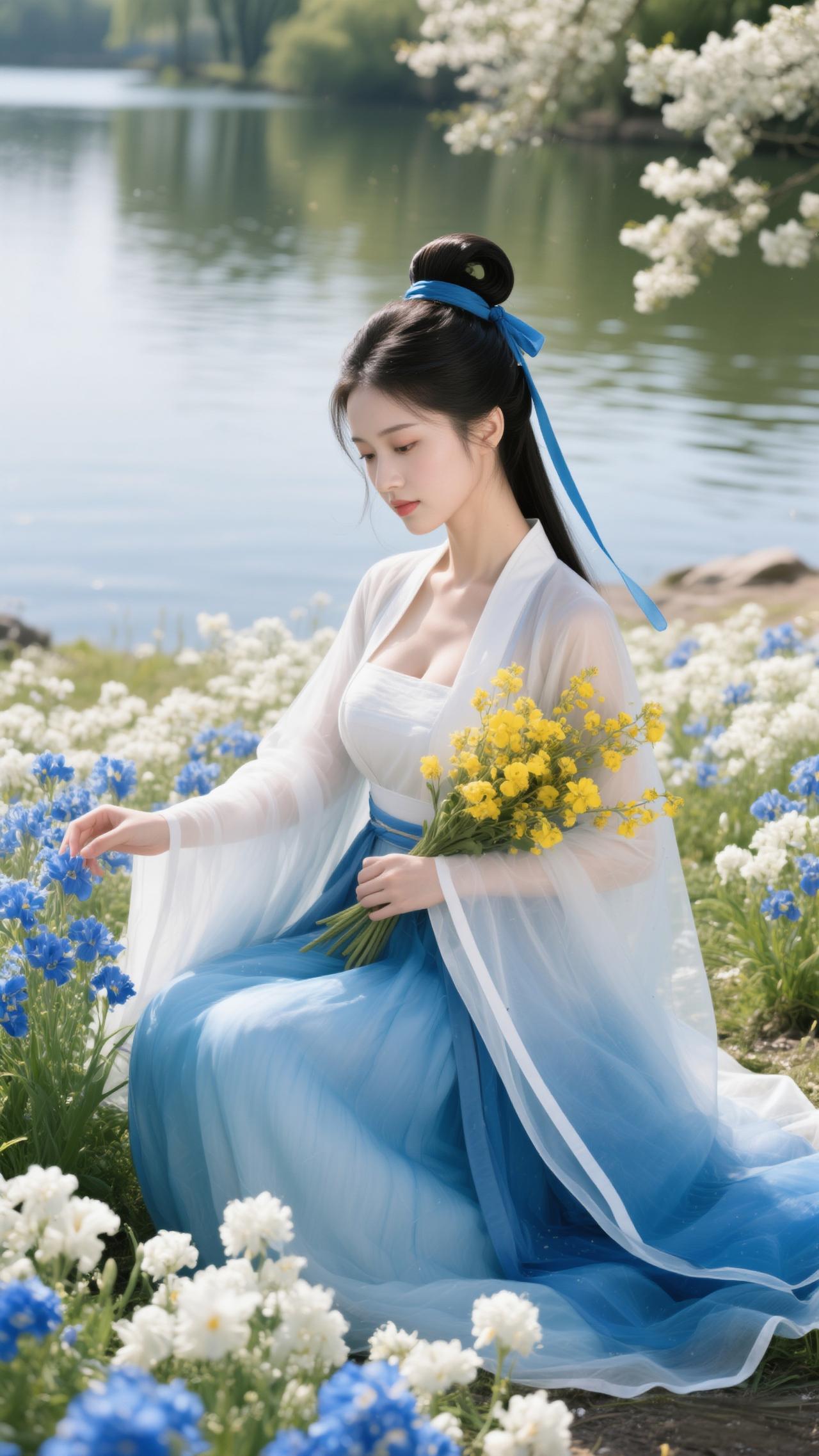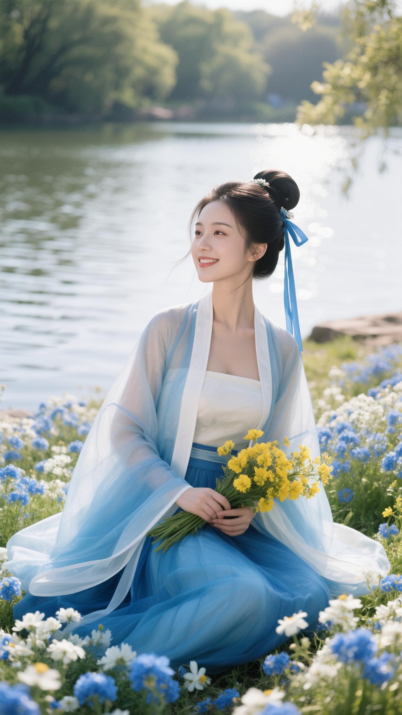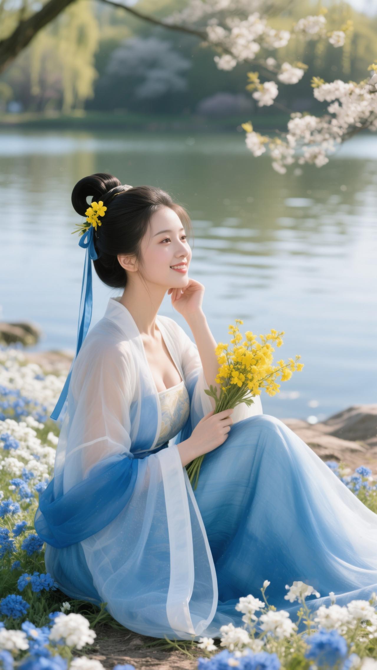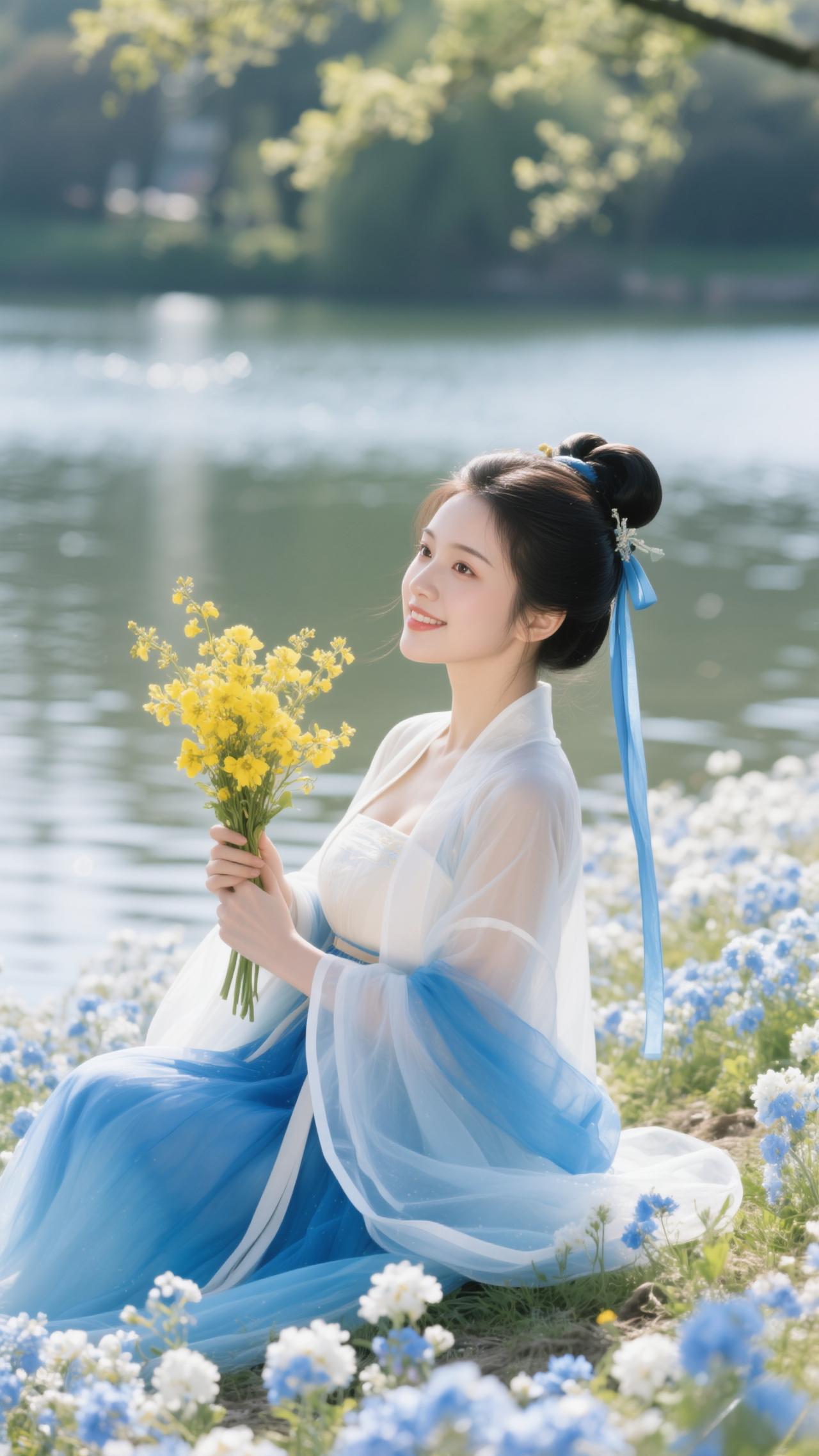 沉醉,沉醉,闲看湖光摇翠。国风古韵 东方美 汉服写真 清纯甜美 原创古风计划 《浣溪沙·湖岸拈黄英》 蓝绡轻曳白罗衣,湖光映袂蘸春晖。 拈花笑坐绿茵肥。 黄英一束凝香软,蓝蝶千丛绕鬓飞。 一襟风暖忘归期。