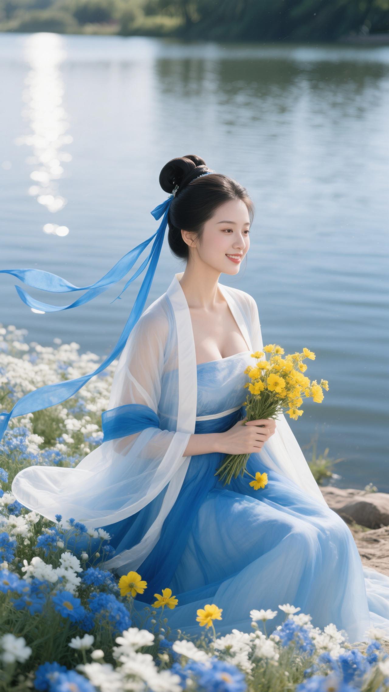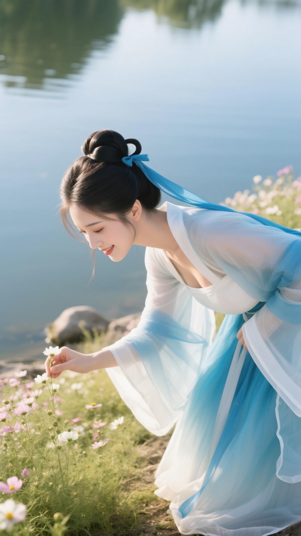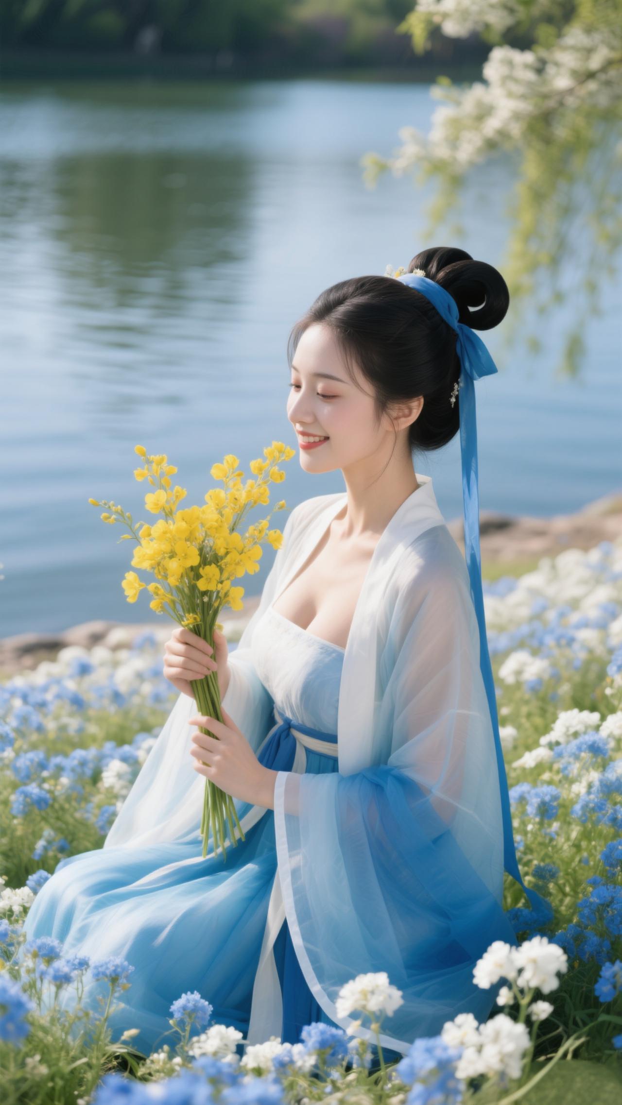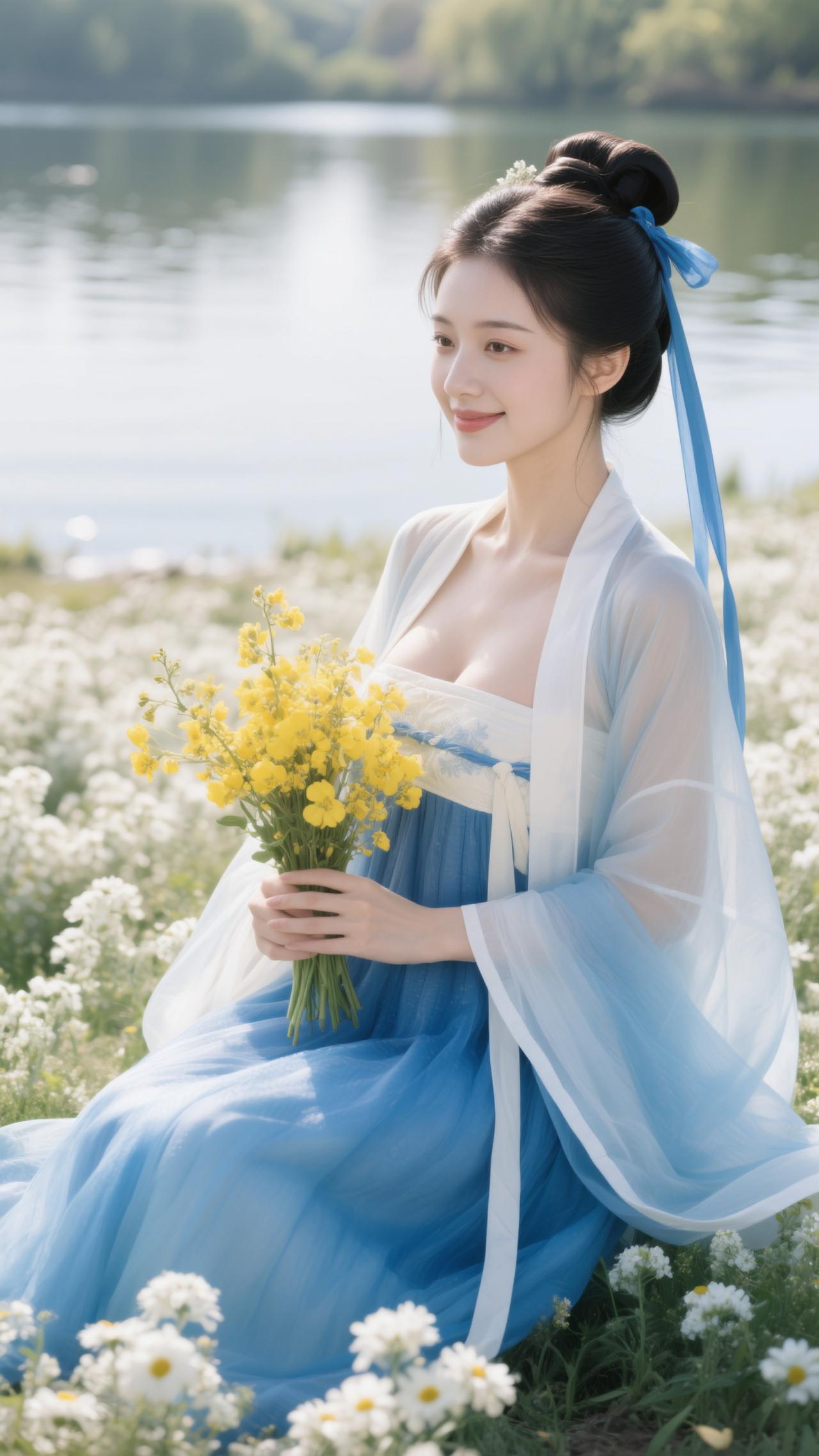 沉醉,沉醉,闲看湖光摇翠。国风古韵 东方美 汉服写真 清纯甜美 原创古风计划 《浣溪沙·湖岸拈黄英》 蓝绡轻曳白罗衣,湖光映袂蘸春晖。 拈花笑坐绿茵肥。 黄英一束凝香软,蓝蝶千丛绕鬓飞。 一襟风暖忘归期。