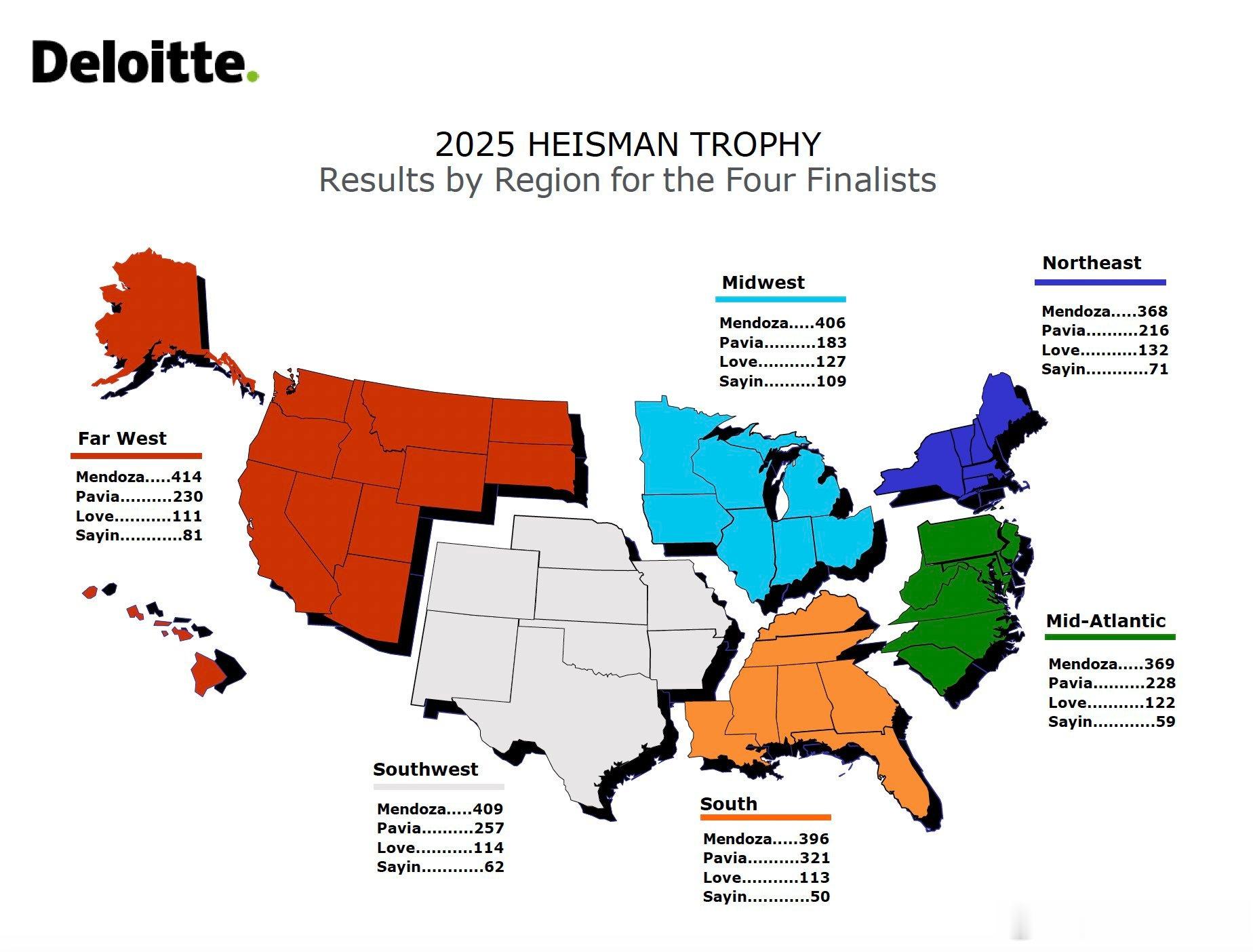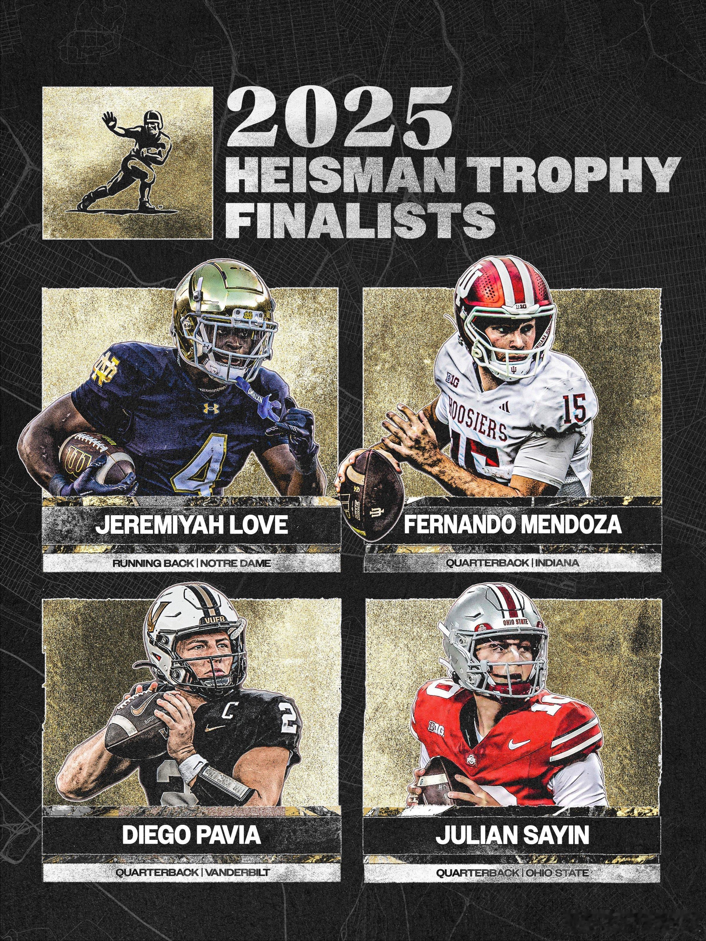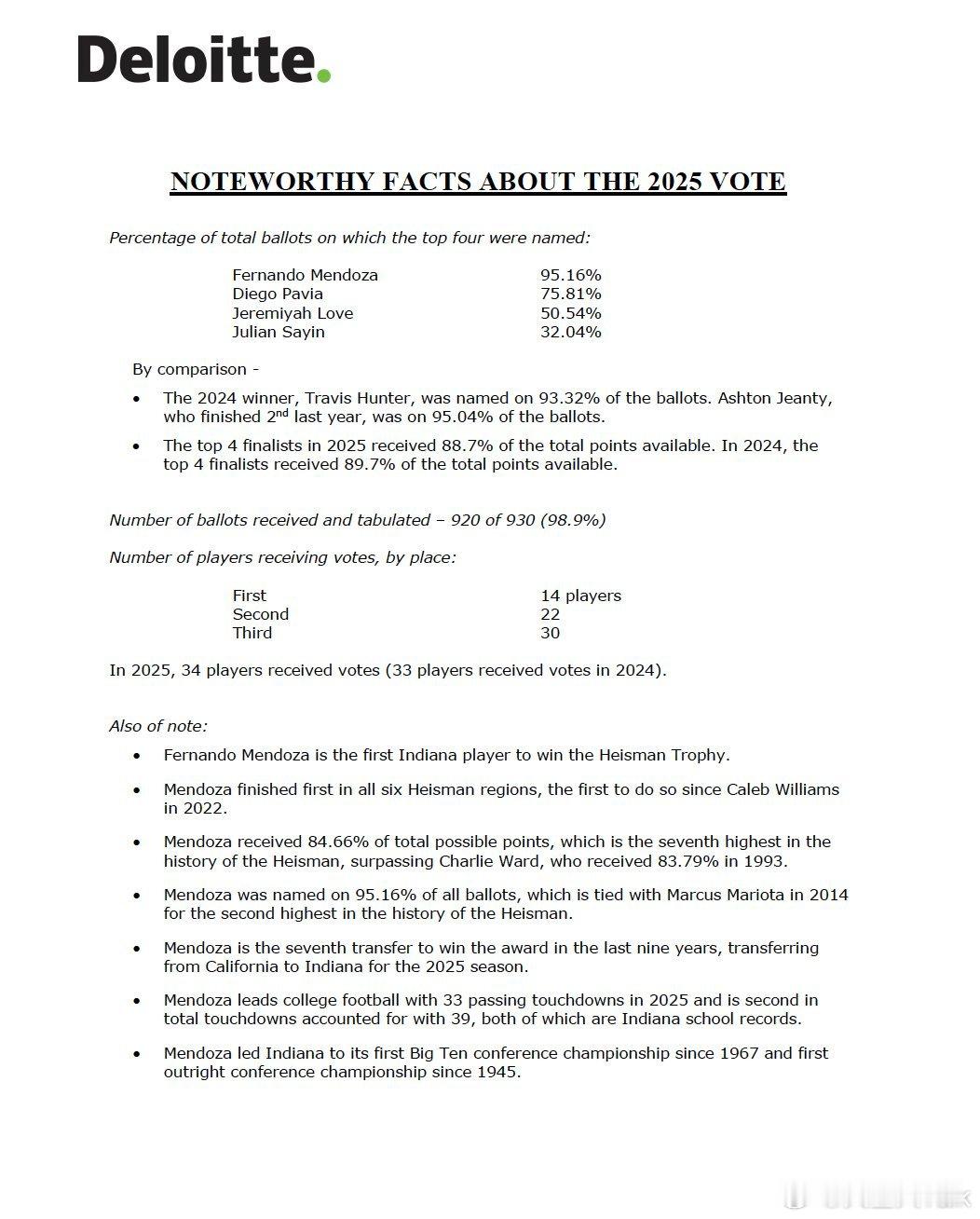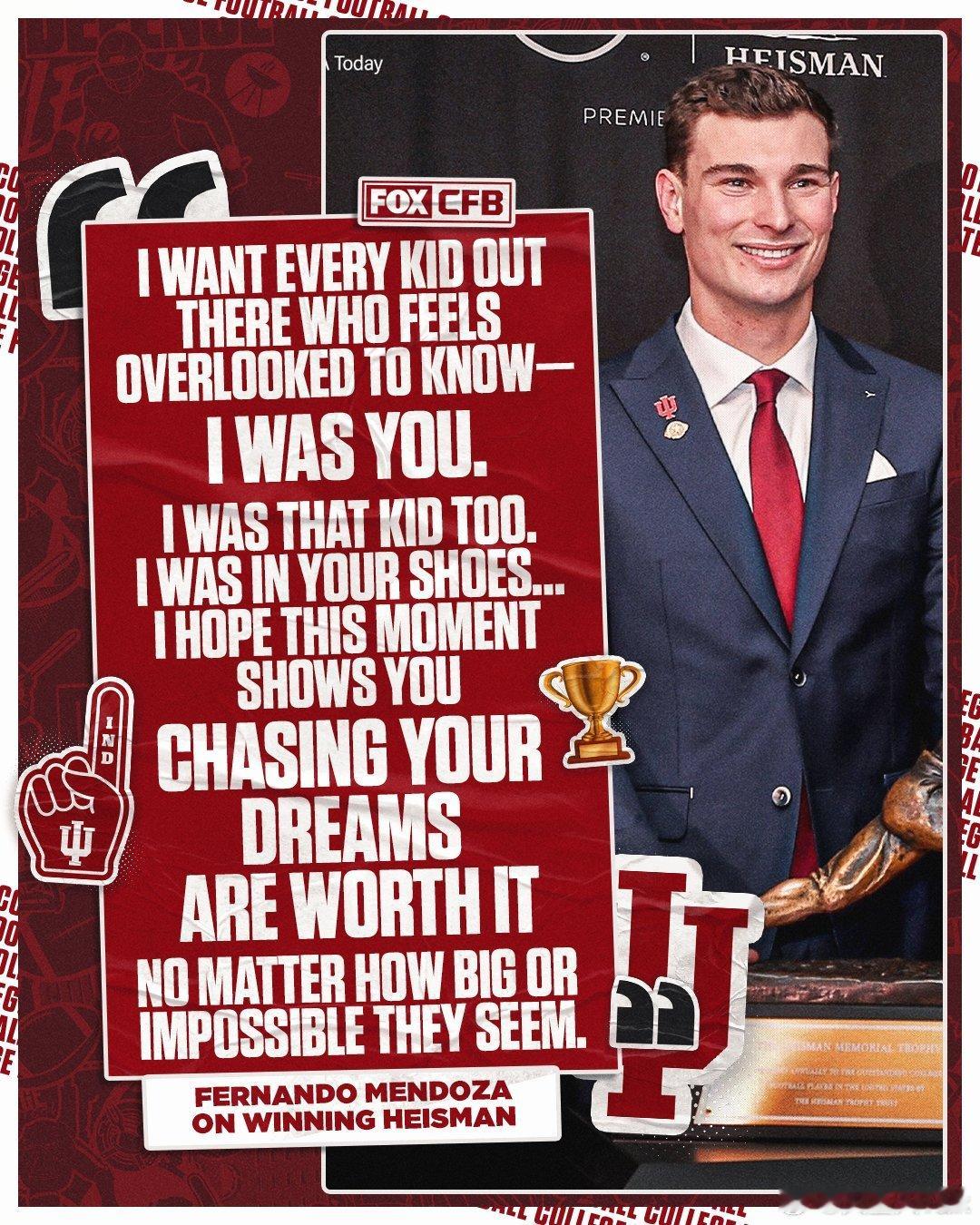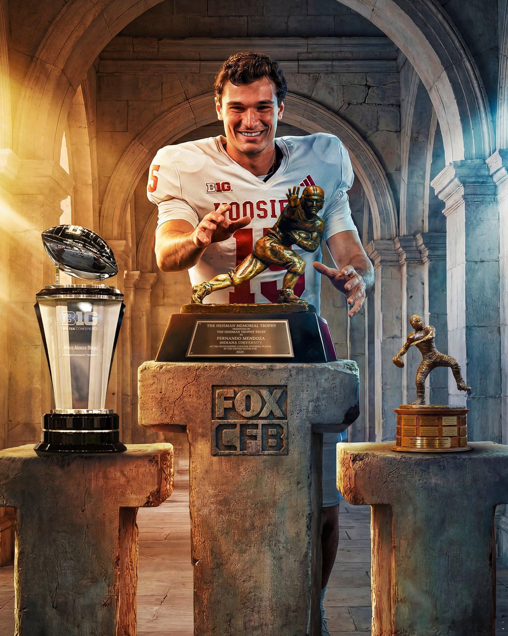 2025年美国大学橄榄球海斯曼奖得主印第安纳大学的Fernando Mendoza,校史首位荣获该奖项的球员,此前最接近该奖项的印第安纳大学球员是1989年的Anthony Thompson。