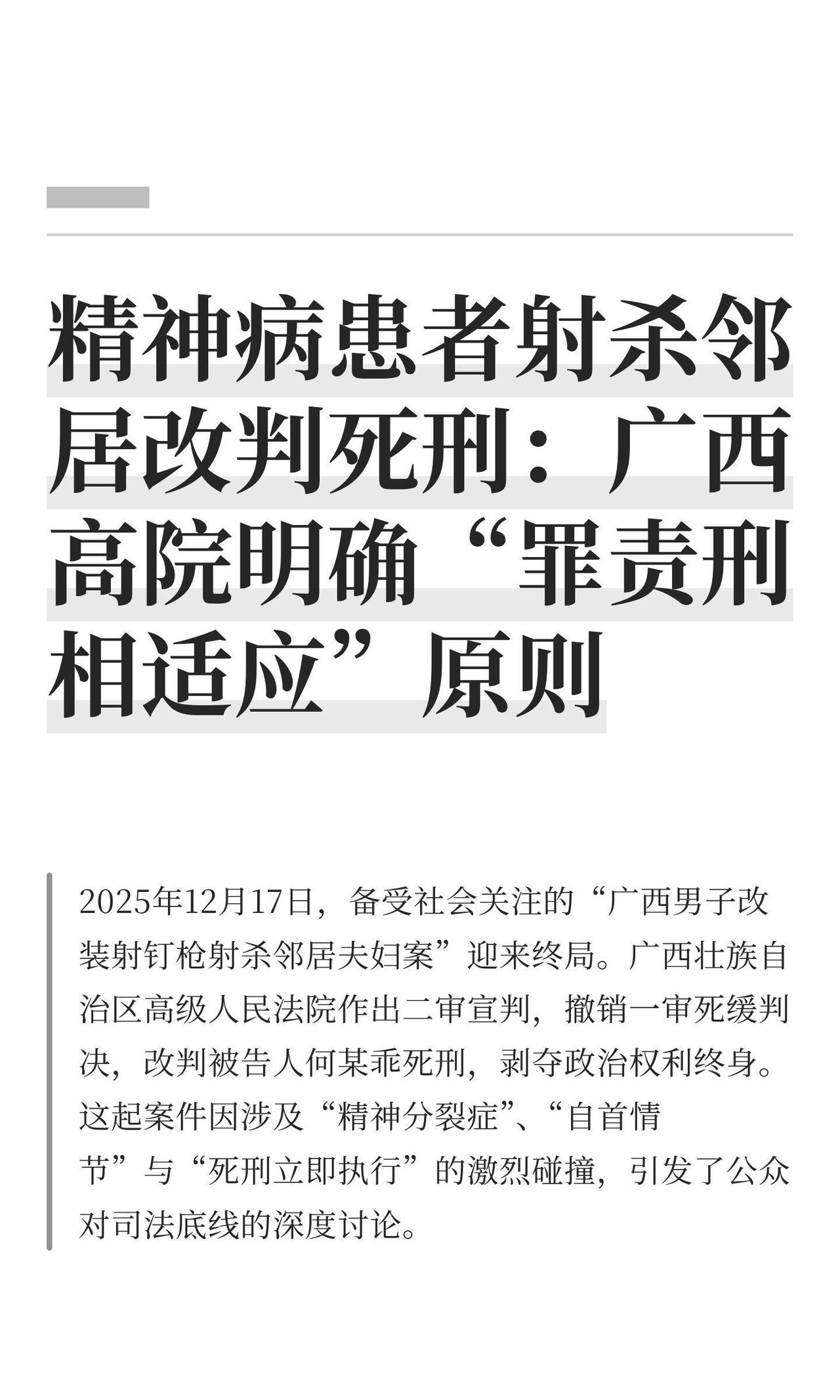 这个事真是又荒诞又可怕。广西有个男的何某,有精神分裂症。他怀疑邻居对他“作法”害他,就把射钉枪改装了,然后把邻居两口子给杀了。这案子判得一波三折,一审判死缓,二审直接改判了死刑。 法院为什么改判?他们认定,虽然何某有精神病,但他在作案的时候,还是有实质性的辨认能力的,知道自己在干嘛,知道杀人犯法。而且这案子性质太恶劣了,两条人命,社会危害极大。所以最后依法判了死刑。 这事一出来,肯定又有人讨论精神病犯罪到底该怎么判。法律有规定,精神病人在不能辨认或者不能控制自己行为的时候犯罪,不负刑事责任。但关键是,怎么判断他当时到底“能不能”?这案子二审法院就是认为,他当时能。而且这种因为妄想就去杀人,还杀了两个,确实太极端了。 说到底,法律得平衡保护社会和保障人权。对何某个人来说,他的病是悲剧;但对那对无辜的邻居夫妇和他们的家庭来说,这是灭顶之灾。法院的改判,可能也是在向社会传递一个信号:精神病不是免死金牌,特别是当罪行极其严重、凶手仍具备一定辨识能力的时候,法律必须做出严厉的惩处。