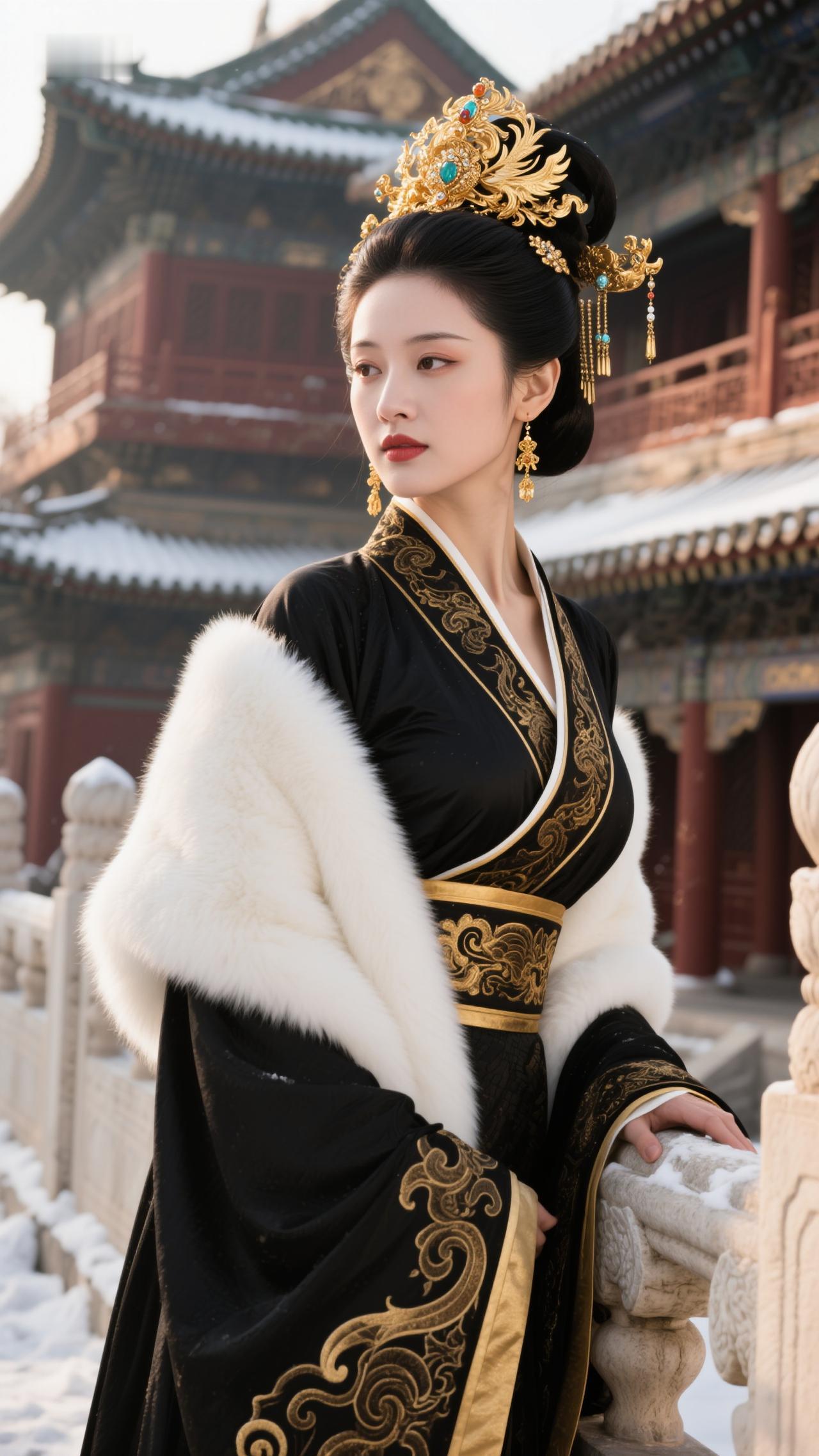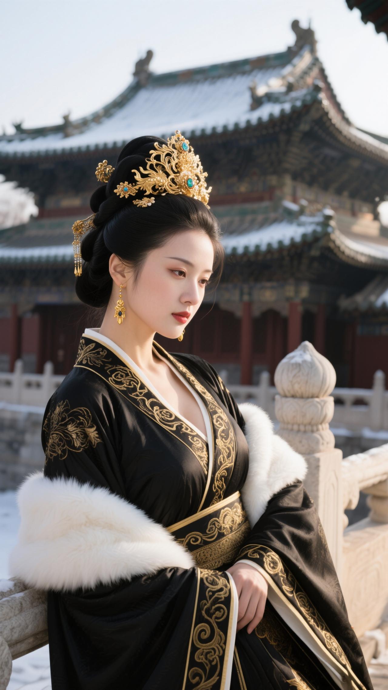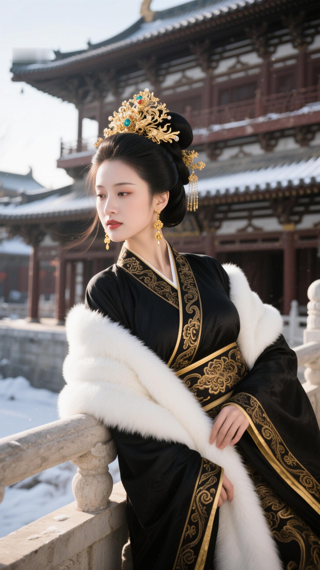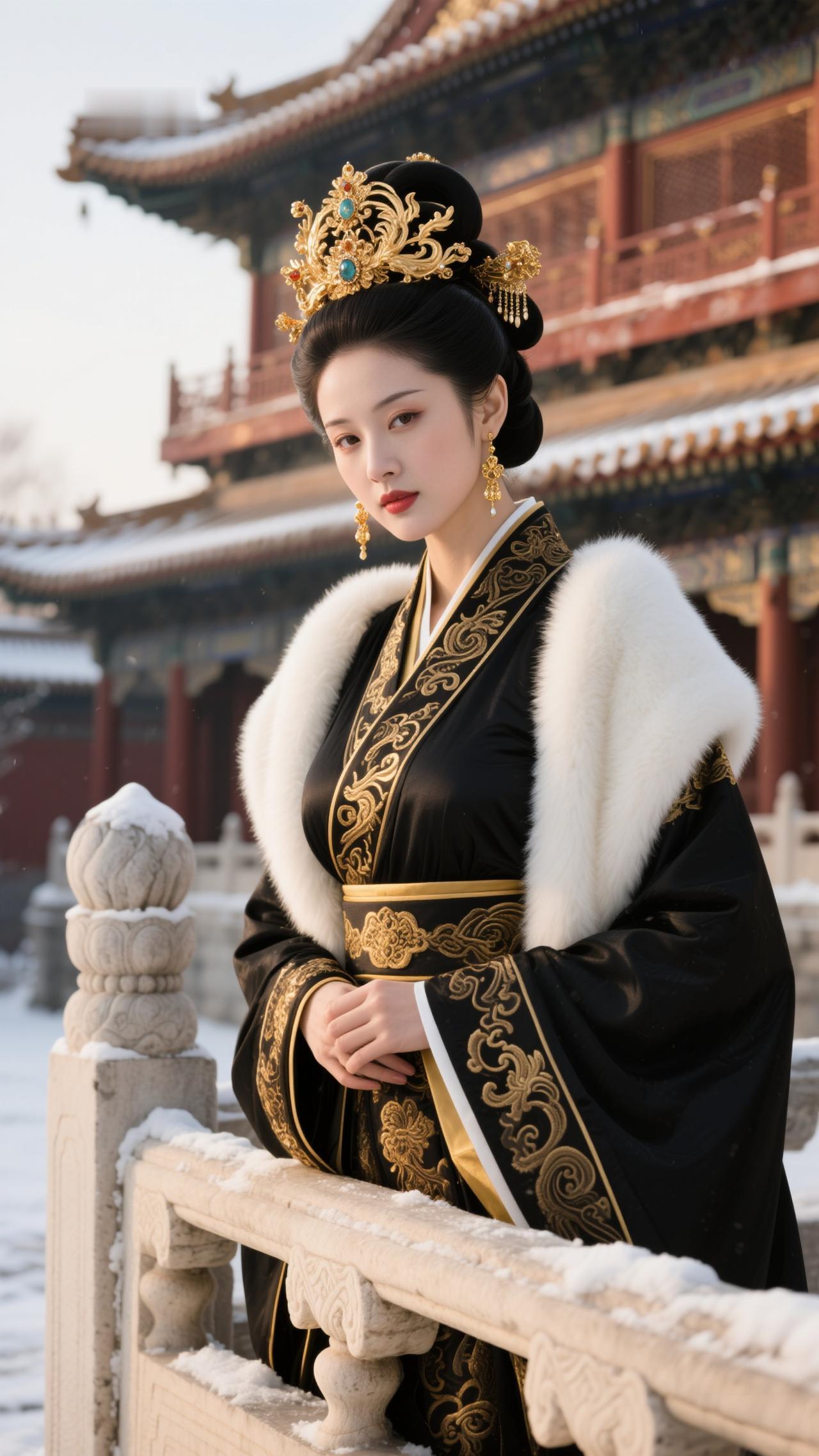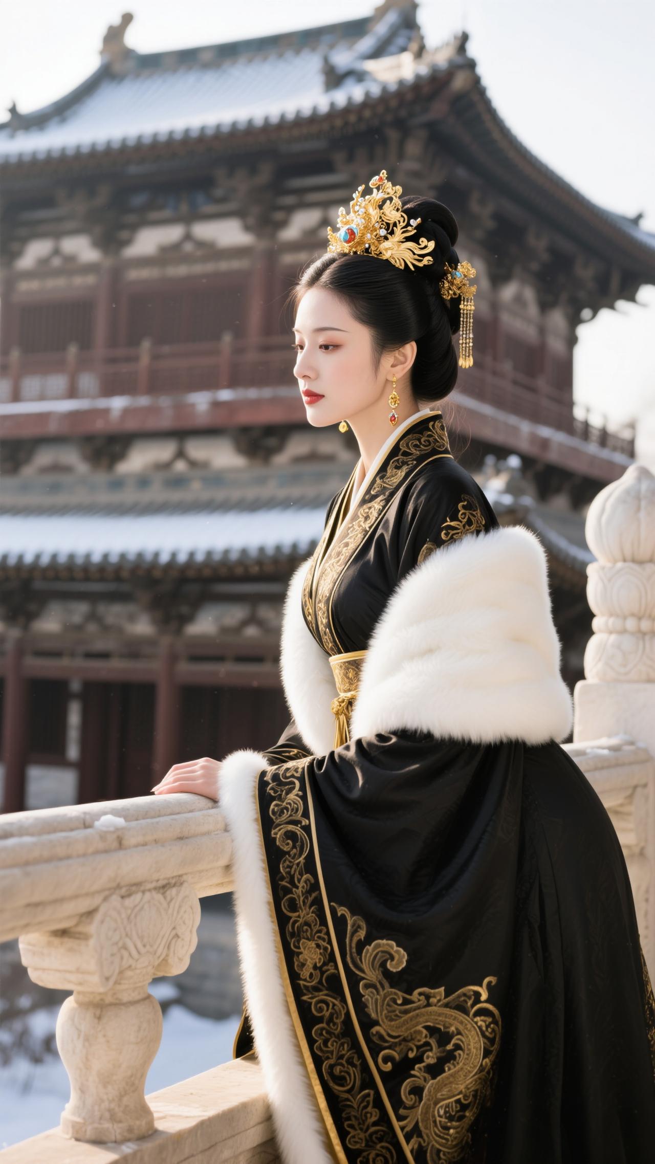 《念奴娇·宫苑雪晴》 黑金裁袂,衬貂裘堆雪,凤冠凝碧。 宫阙琼楼银裹玉,一抹红唇凝寂。 倚槛凝眸,披风沾絮,傲骨凌霜立。 江山如画,一身豪气吞碧。 遥想紫殿笙歌,繁华过眼,今作霜天客。 金缕衣轻承冷雪,不借春风怜惜。 笑指苍茫,心藏丘壑,步履生寒璧。 雪光摇影,一身清贵无匹。