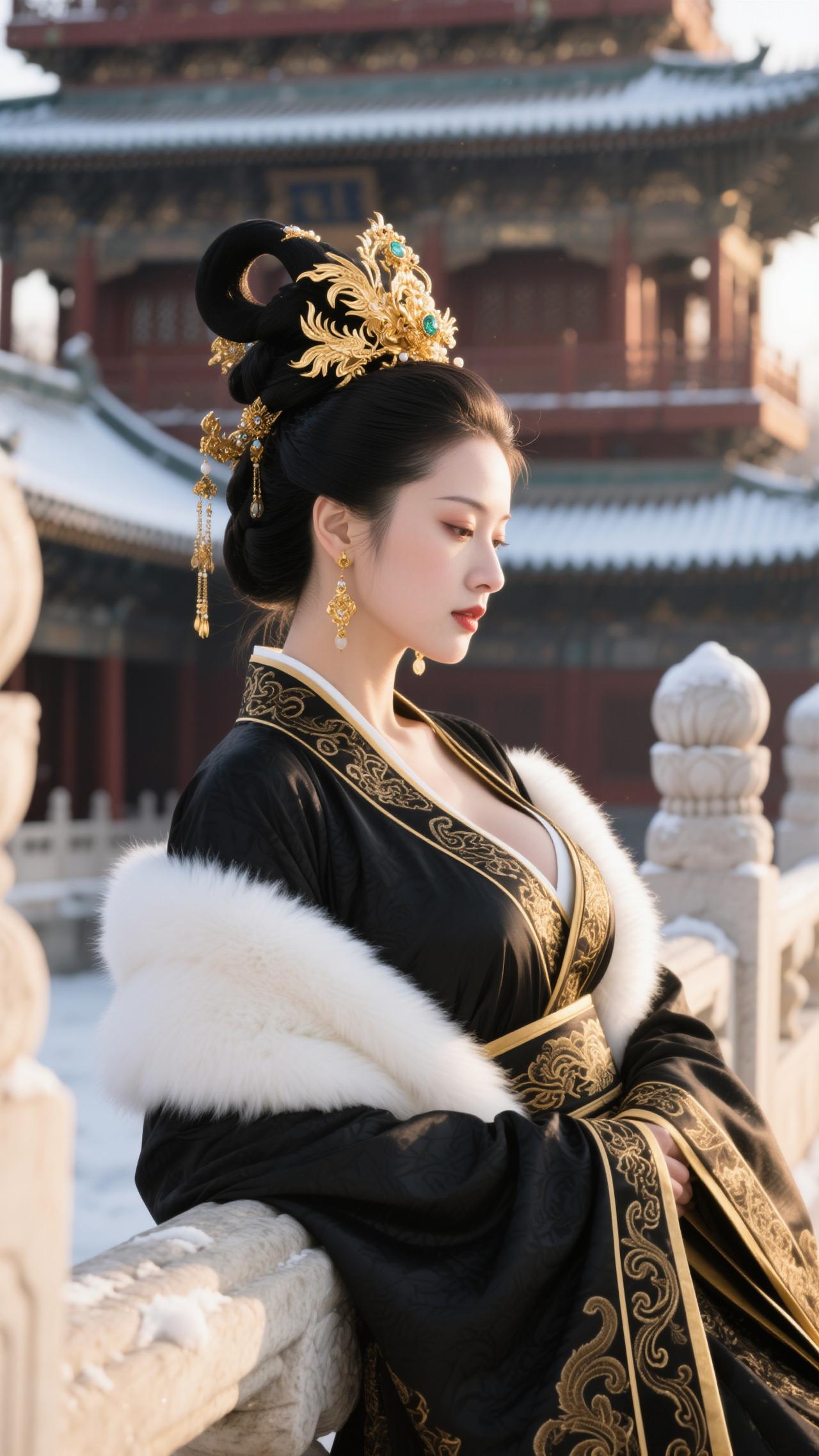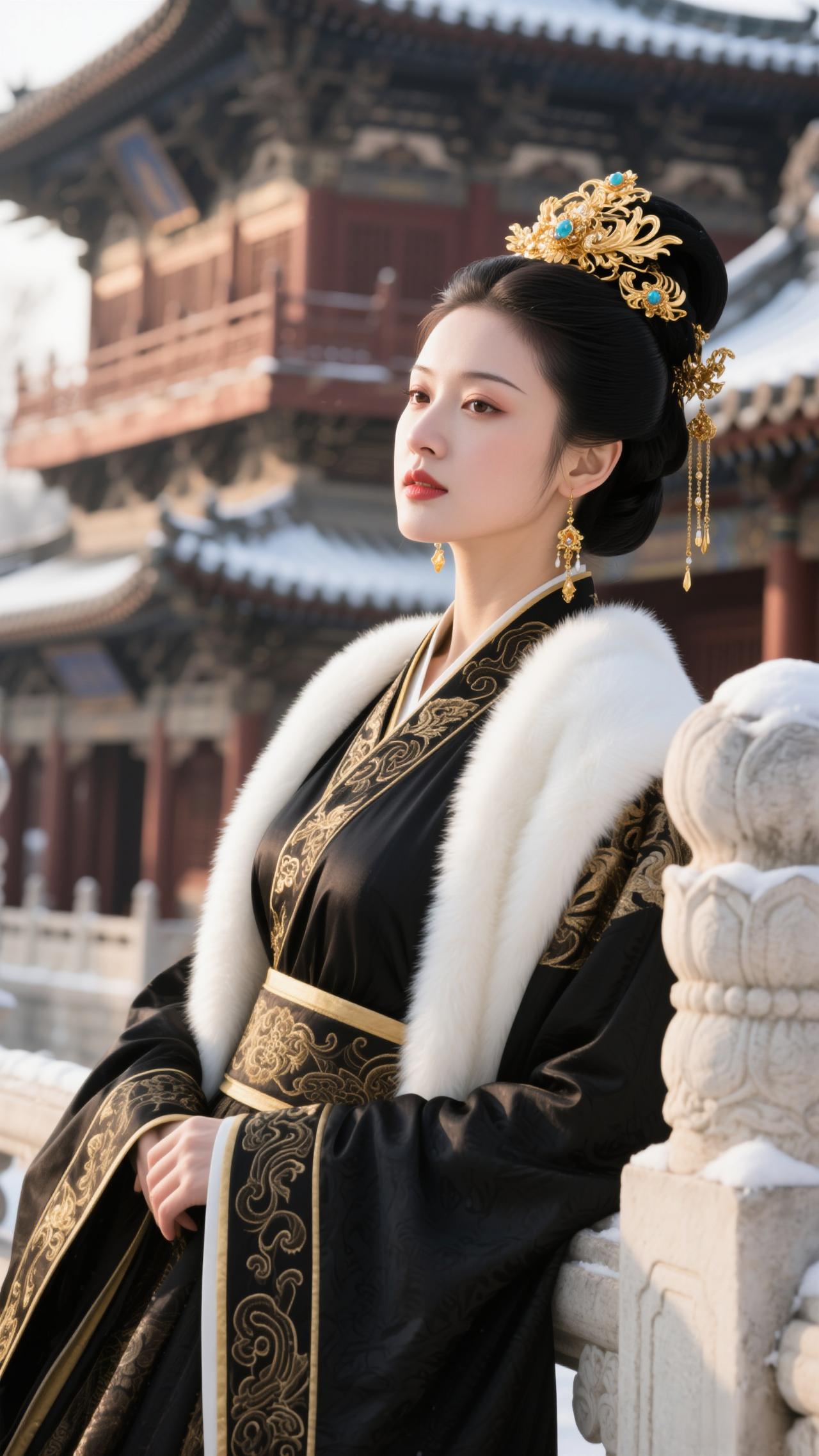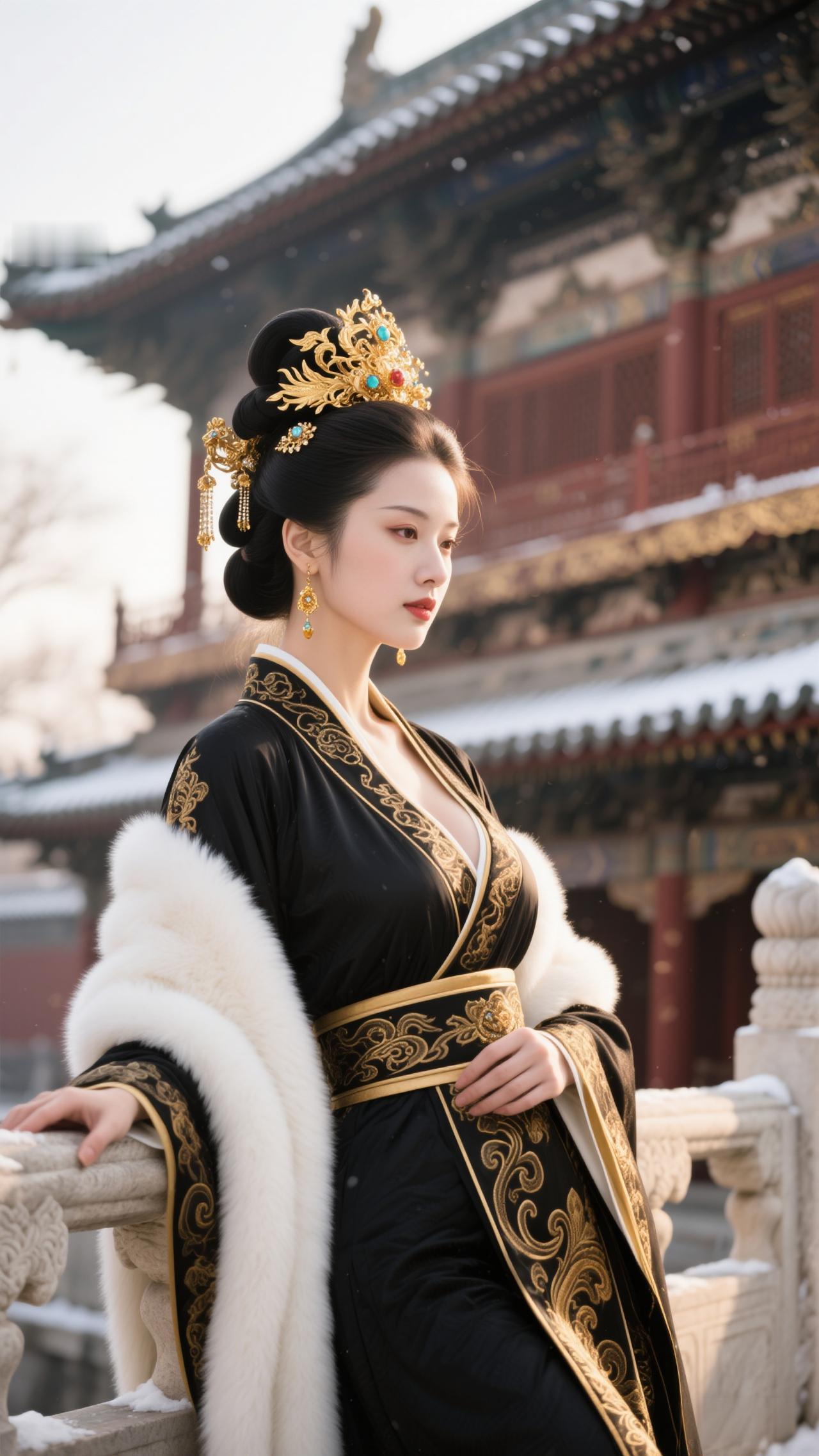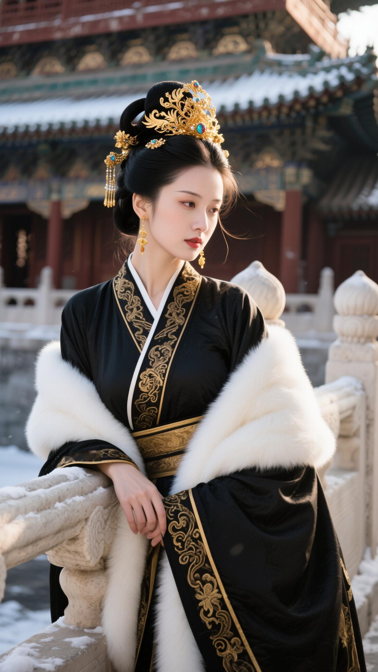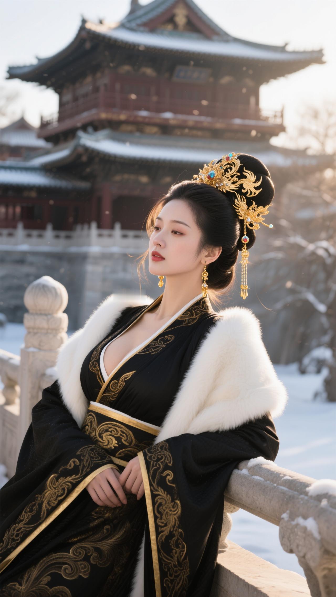 《念奴娇·宫苑雪晴》 黑金裁袂,衬貂裘堆雪,凤冠凝碧。 宫阙琼楼银裹玉,一抹红唇凝寂。 倚槛凝眸,披风沾絮,傲骨凌霜立。 江山如画,一身豪气吞碧。 遥想紫殿笙歌,繁华过眼,今作霜天客。 金缕衣轻承冷雪,不借春风怜惜。 笑指苍茫,心藏丘壑,步履生寒璧。 雪光摇影,一身清贵无匹。