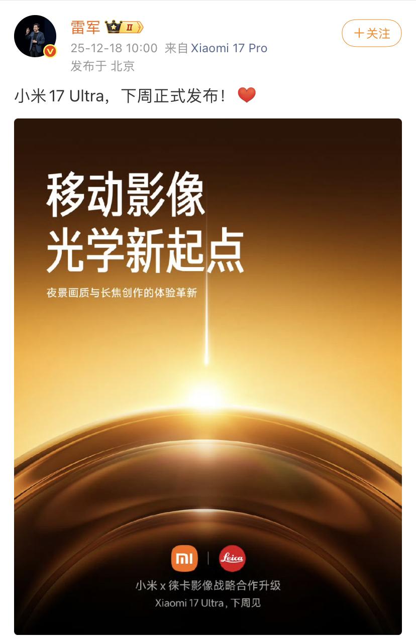 雷军:小米17 Ultra,下周正式发布! 小米17ultra手机来的这么快,真的是非常的没想到啊,新手机在影像功能上拥有了巨大的进步,还真期待下一周早点到来。 小米现在出手机的速度真的是非常的快,大家都使用过小米的手机吗?感觉怎么样?欢迎评论区留言。