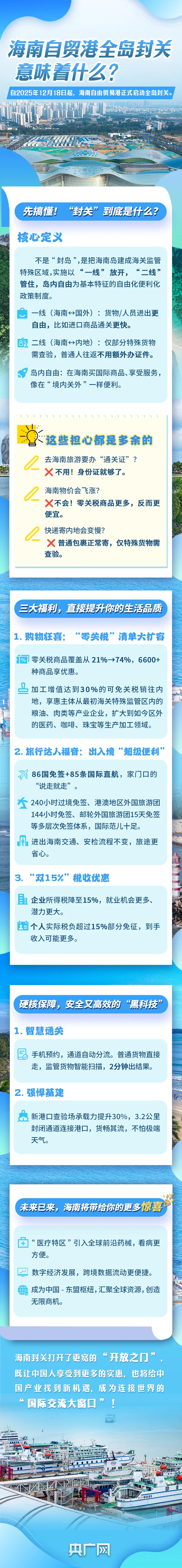 #一图读懂海南全岛封关#【今起,海南全岛封关!意味着什么?】2025年12月18日海南自贸港迎来全岛封关运作,什么是封关运作?“一线放开、二线管住、岛内自由”是什么意思?封关后去海南需要办理通行证吗?有哪些福利优惠?一图读懂↓↓↓(央广网)