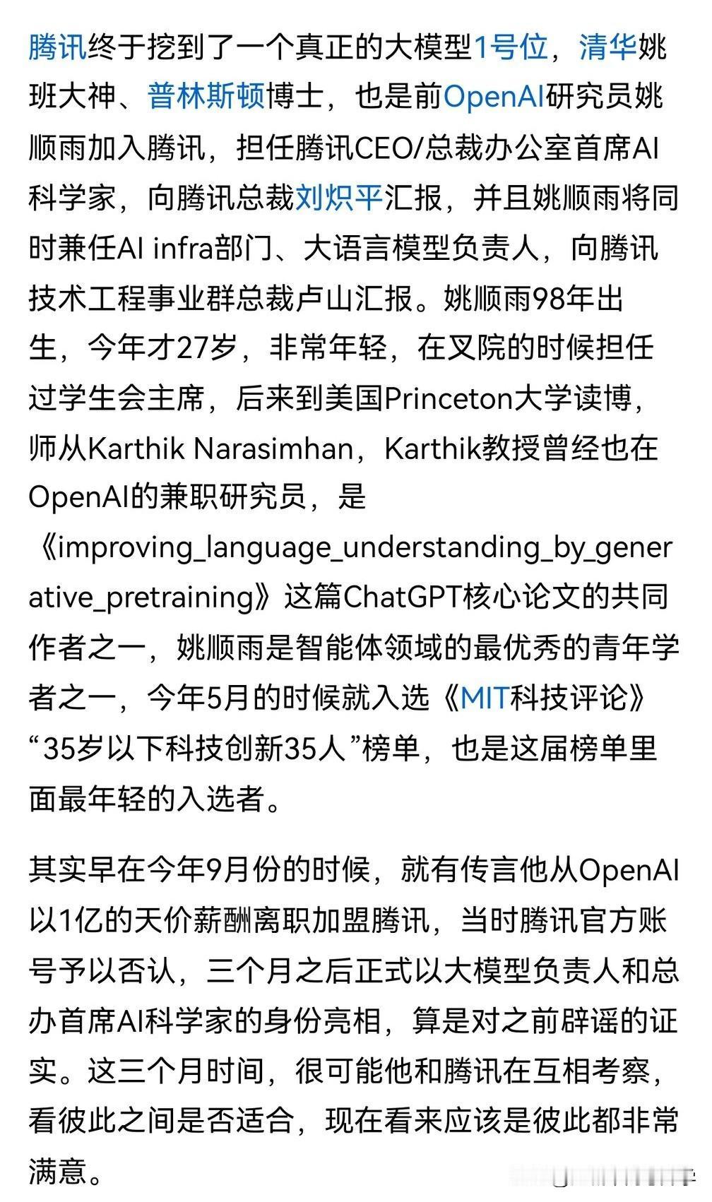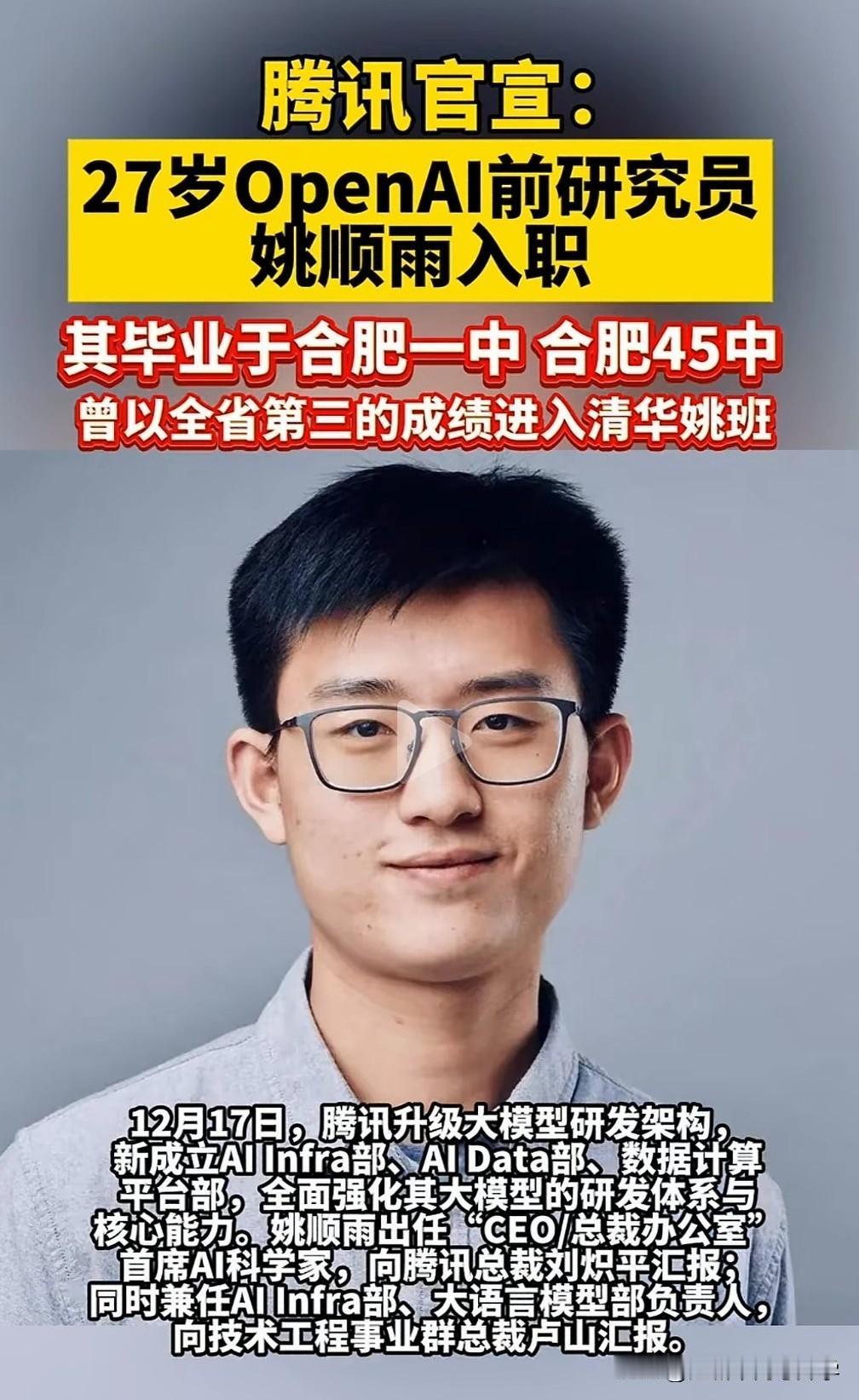 腾讯官宣27岁的姚顺雨出任首席Ai科学家 真是年轻有为,合肥人,毕业于合肥一中, 安徽省全省第三考清华姚班,学生会主席, 博士毕业于漂亮国普林斯顿大学, 曾经在OpenAI为其核心骨干成员, 如今高薪被腾讯挖来担任如此重要的职位。 这个社会从来都不缺天才, 但是一直都缺人才, 在某个领域表现出极端的天赋, 在不断的在社会的需要的前沿领域, 做出能推动时代进步和发展的成果, 那么炙手可热被高薪挖走就是时间问题, 无论何时要记得把自己变得值钱, 最好是能拥有无人可以替代的技能和研究, 稀缺的能力从来都是无价的。