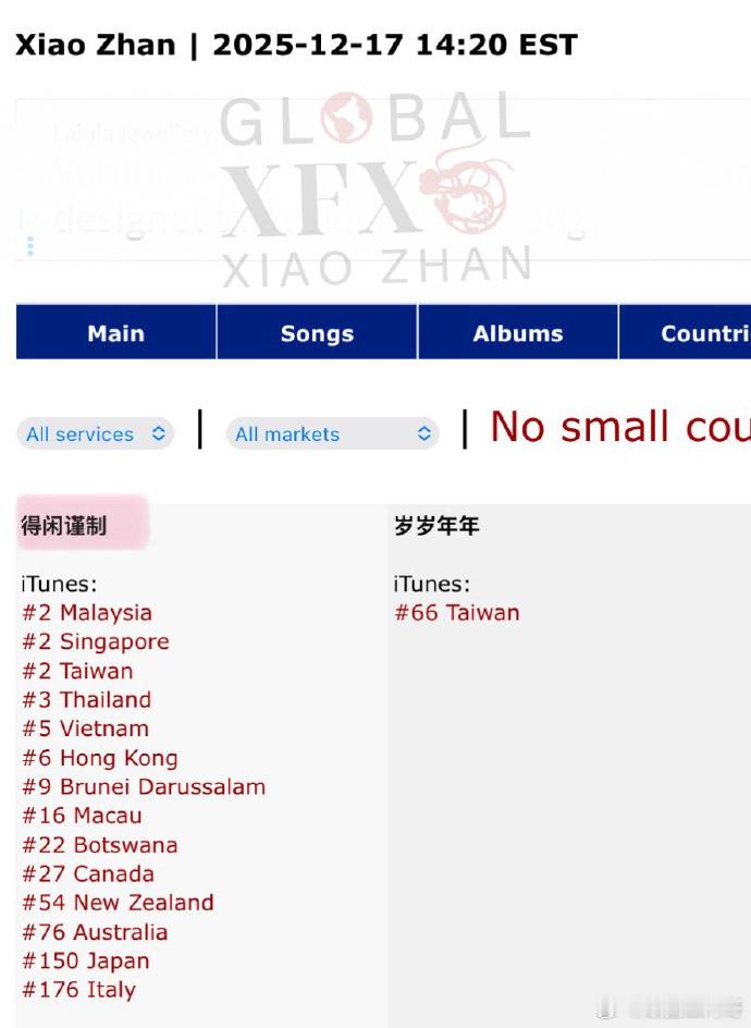 肖战《得闲谨制》同名主题曲登陆海外,目前登上全球itunes单曲畅销榜29位,并登顶中国香港、中国台湾、文莱、新加坡4个地区itunes单曲榜首,还登上共计14个地区单曲榜