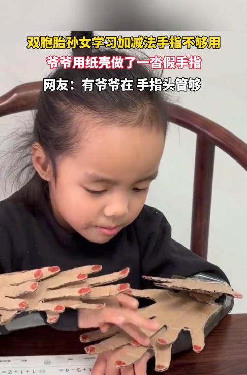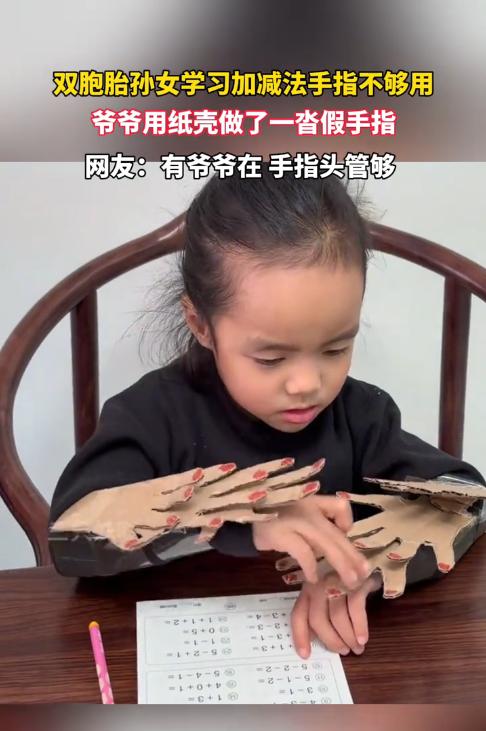“人怎么能这么聪明!”12月15日,山西运城,双胞胎孙女刚开始学算数,只能通过数手指来计算,可自己的手指头不够用,就去“借”妈妈的用,爷爷看到后,把废纸箱剪成手指形状,让孙女们尽情的数!网友:考试不让带怎么办? 不知道大家有没有辅导过孩子写作业,这对很多家长来说,都是很头疼的一件事,由于是自己的孩子,还不舍得说,有时候一个简单的问题却要教好几遍,把人都快搞崩溃了! 倪女士的双胞胎女现在刚开始学算数,老师教了她们用手指来计算,两名孩子倒是学会了这一点,回家做作业时就一直掰着手指头在那里算数。 可是有的题目却超过了10,这让孩子们犯了愁,只能把妈妈的手指头也“借”过来一起数,可是这却耽误了倪女士干活。 爷爷看到后心生一计,他找来家中没有用的废纸壳,裁剪成手指的模样贴在孙女手上,这样一来就多出来一双手,不够用的话就再贴上一双,绝对管够! 这么一来,两个孩子不仅成功解决了难题,倪女士也解放出来去干别的活,结局皆大欢喜。 网友看后表示,自己当年怎么没想到这么办法,都是让孩子去数脚指头,果然岁数大的人点子就是多! 信息来源:《双胞胎孙女做加减法手指不够用,爷爷用废纸壳做了一沓假手指。网友:有爷爷在,手指头管够!》新华网