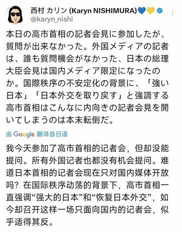 法国记者吐槽高市早苗“放空话!” 原来这名记者日前参加了高市早苗的记者会,但是却全程没有获得提问的机会。 而且不光是她一个人,而是所有到场的外国记者都没有得到提问的机会。 为此这名法国记者吐槽说,“难道日本首相的记者会现在只对国内媒体开放吗?”她还质疑高市早苗强调“恢复日本外交”,如今却只对国内记者进行提问,忽视外国记者这就是“适得其反”。 说白了,她认为高市就是“讲空话”而已。 那么高市早苗为什么不给外媒记者提问的机会呢? 其实很明显,一是她对外社交的能力有限,不知道会怎样面对记者提出的刁钻提问。二是日前日本和邻国之间因为高市的错误言论闹得不可开交。她害怕外国记者会在提问时提出让她难以回答,甚至是难堪的问题。如果是这样怎么回答都不会得体,所以她才拒绝外国媒体的提问,希望本国记者不要提出让其难堪的问题。 从这个角度来讲,高市已经开始认识了问题的严重性。虽然嘴上还没有服软,但行动上开始可以低调,大家觉得呢?