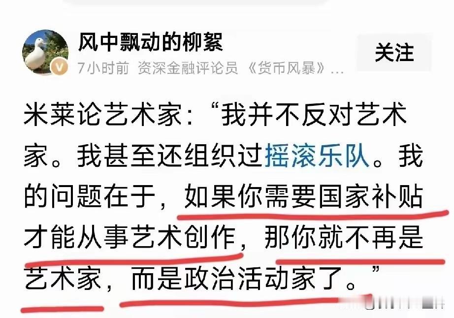 阿根廷总统米莱论艺术家时直言:“不反对搞艺术,我甚至还组织过摇滚乐队。但如果你需要国家补贴才能从事艺术创作,那就不再是艺术家,而是政治活动家了。”此言论引发争议。 米莱的逻辑直指核心:靠政府补贴的艺术或媒体,本质是依附权力生存。 但是我觉得靠本国补贴无可厚非。但是若社会工作者、媒体宣传需外国政府补贴才能运作,那样才应被归类为政治活动家或政治媒体。这并非否定其价值,而是明确其属性——其立场和行为需服务于资助方的利益,本质上是在进行政治活动。