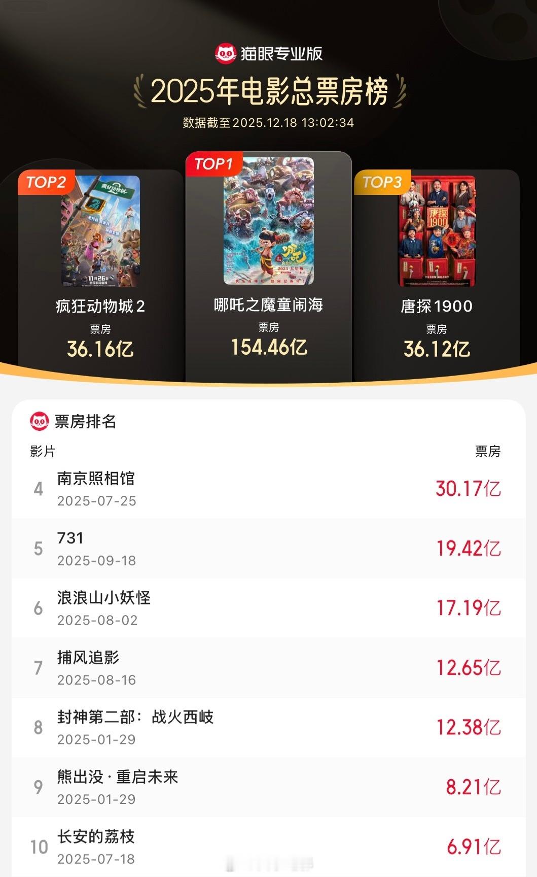疯狂动物城2年度票房第二感谢《疯狂动物城2》带来的欢笑,🦊狐兔🐰CP狠狠磕!截至目前,累计票房破36亿,超过《唐探1900》36.12亿,排2025年度总票房榜top2,前二全是动画电影,太腻害了。跨年电影愿2025年度电影结算画面