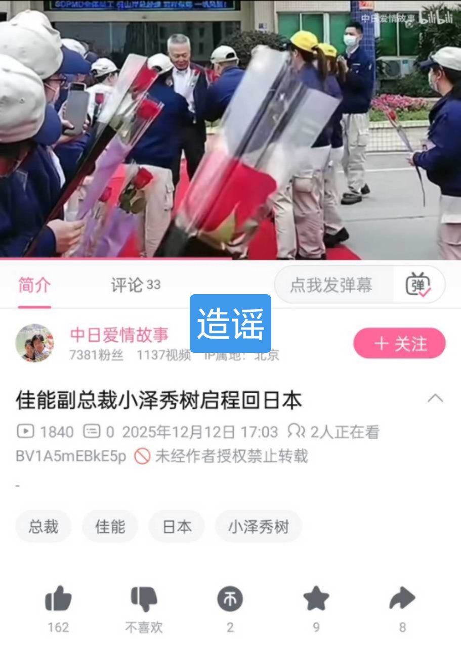 佳能讽副总裁小泽秀树发文辟谣,他没有启程回日本,工厂也没有关闭。但全网都是图二这种造谣,应该是把别的工厂的盛典视频盗用了(图三应该是原图,不是佳能的)。