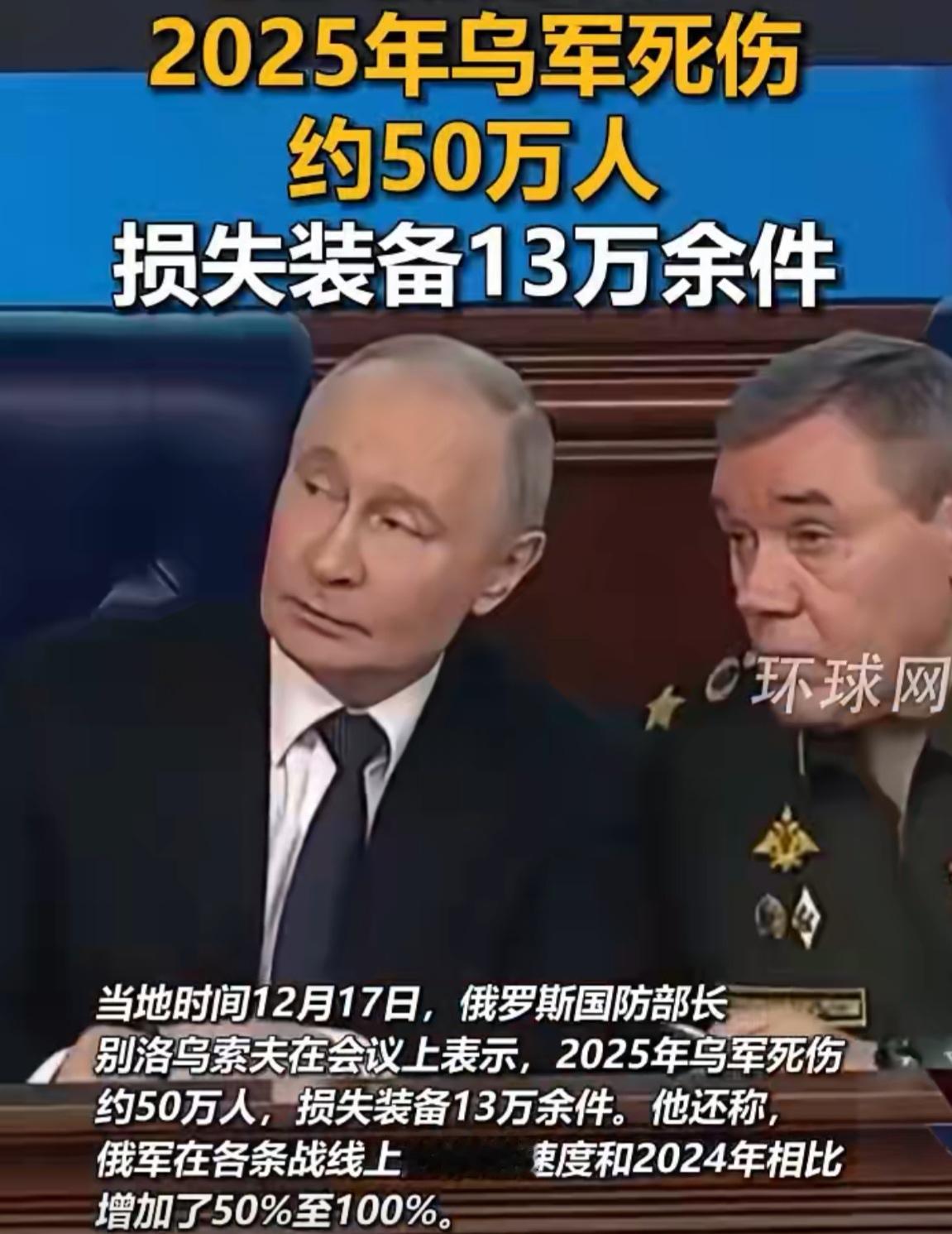 俄罗斯公布,2025年乌克兰方面共伤亡50万人。根据俄国防部信息显示,开战以来,乌克兰共伤亡150万人,其中2024年和2025年均超过50万人。 乌克兰方面每日都会发布俄军的伤亡情况。截至2025年12月16日,自开战以来,俄军累计伤亡人员约119.06万人。 乌克兰军方称这个数字是基于卫星监测、战场情报、俘虏口供和截获的通信综合估算出来的。