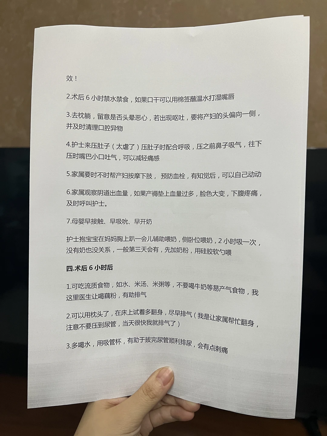 6⃣️术后6小时内要让宝宝早接触、早吸吮、早开奶。护士抱宝宝在妈妈胸上趴一会儿辅助喂奶,刚开始喂奶腹部会疼,是正常现象,是子宫在收缩帮助排恶露和子宫恢复