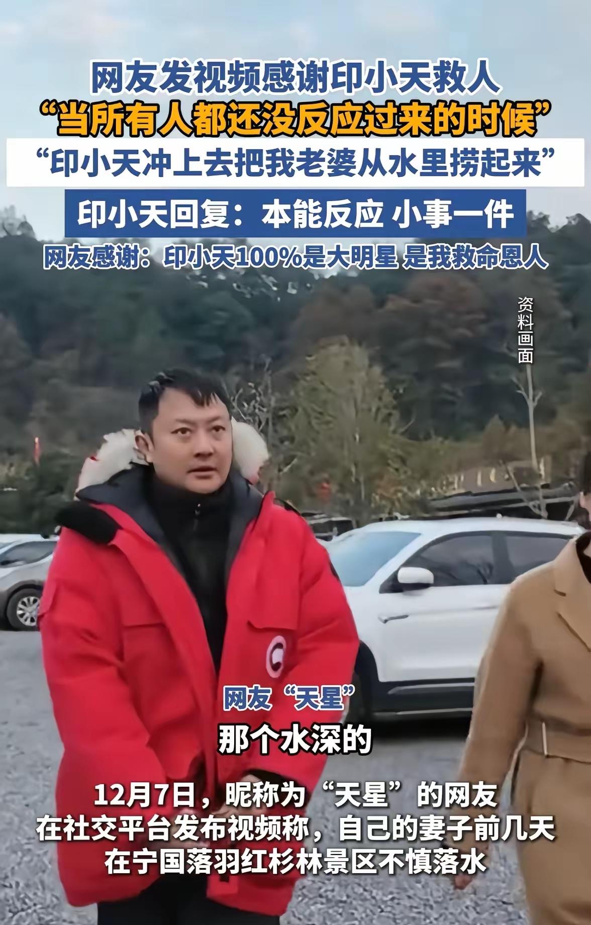 景区10秒救人的47岁印小天,最好的回报来了,不是对方拿出10000感谢费,而是被救者丈夫、当地文旅推荐官宋先生,至今提起救人场面还激动到不行! 12月底的安徽宁国落羽红杉林景区,栈道边的警示牌前围了不少游客,宋先生站在人群外,右手不自觉摩挲着手机壳——那里存着段没对外发过的语音,是救人第二天他给朋友打的,里面除了急促的喘息,就是反复念叨:“他手掌破了还问我爱人冷不冷……” 警示牌上多了组动画,画着个穿羽绒服的男人半蹲在水里,双手托举着什么,底下配着行字:“善意是最好的安全保障”。景区安全员说,这是按印小天当时的姿势画的。 时间拉回二十多天前那个下午,红杉林的栈道挤满举着相机的游客。宋先生正和印小天商量文旅宣传素材的角度——印小天刚拍完《种墨园》,前一天还帮当地公安拍了交通安全片,算是“半个宁国人”了。 “我爱人说要拍红杉倒影,就一点点往后退。”宋先生突然压低声音,“我刚想喊小心,她脚下一滑,整个人就没进湖里了——那水看着浅,底下全是烂泥,她一慌,头发全飘在水面上,手乱抓。” 周围瞬间静了,有人举着手机忘了按快门,有人急得喊“快救人”。宋先生往前冲时,栈道边的青苔让他打了个趔趄,差点跟着掉下去。 就是这两秒,印小天已经冲过去了。宋先生没看清动作,只记得羽绒服袖子扫过脸颊时的冷风,再站稳,印小天半个身子浸在水里,双手死死抓着他爱人的胳膊,膝盖在石头上磕出闷响,还是咬牙往上托。 三次,试了三次才把人托到栈道边。上来时,印小天的羽绒服能拧出水,裤脚全是泥,右手掌被石头划了道口子,血混着泥水,他看都没看,帮着扶进休息室,转身就去卫生间拧衣服。 等宋先生安顿好爱人追出来,只剩助理在收拾东西:“印老师说别耽误你们,先走了。” 网上有人说“明星救人不就是作秀吗”,宋先生却托朋友去《烈火英雄》剧组打听——当年印小天为演消防员,专门参加过一个月水域救援特训,教练教的“托举时保持落水者面部朝上”,这次全用上了。 中戏老同学也说,他们上学时有应急反应训练,印小天是班里反应最快的,别人还在犹豫“要不要动”,他已经冲出去了。更意外的是,2023年宁国洪灾,印小天悄悄捐过一批救生衣和食品,没留名字。 现在游客路过警示牌,都会停下来看动画,还有人主动提醒身边人:“往后退时小心点,别像那天那个阿姨一样滑下去。”景区工作人员说,这比发多少安全手册都管用。 记者去剧组采访印小天,他正给群演讲戏,聊起救人的事,只是挠挠头:“当时就想着别让人家出事,换谁都会这么做。”社交账号里,还是红杉林的美景、剧组的日常,救人的事一个字没提。 从当年舆论风波的低谷,到如今默默行善被人记挂,13年时间,印小天没靠炒作,没靠人设,只是用一件又一件小事证明:真正的价值从来不在聚光灯下,而在有人需要时,你敢不敢往前冲的那两秒里。 宋先生现在带游客逛红杉林,总会指着警示牌说:“你听,湖水的声音还是那天的哗啦响,但我记住的,是有人没等你喊救命,就已经冲过来的脚步声——沉,且快。”