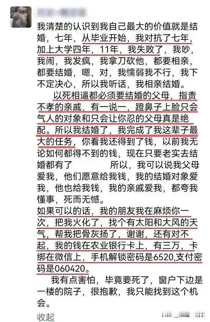都说这个世界上最爱你的人应该就是父母了。可从河南28岁即将新婚的坠亡女教师事件来看,有些父母也不见得就爱自己的子女。 最近,这位姑娘的事件仍在发酵,不说社会压力,不说实际里面存在多少我们作为外人不为人知的秘密。因为,事事都有因果,虽然对这位年轻姑娘感到惋惜,但是从这个事件来看有件事是很难理解和认同的。 小编初为人父母,对于自己的孩子不管怎么样,我断然不会如此相逼,不论我的子女出息与否。 从姑娘的遗书来看,来自于父母的压力何其大,没有成家的她估计在这个世界上已经感受不到有爱她的人了(也许作为教师,她的学生还是爱她的),所以在压力爆发边缘没有了任何留恋。 况且,都已经准备结婚,看似准备得过且过了,结果一下子就是黄泉相隔。据网上消息说是临到头父母又要加彩礼,如果是真的,那么那一刻,姑娘内心一定再次失望,因为她就是一件“物品”,待价而沽的物品。 更让人心寒无语的是她死后竟然没有人收尸,父母当做已嫁出去,男方没有迎亲成功自然也不愿管。从姑娘的遗书可以看出来,她也提前预见了这个情况,所以说如果可以,请求她的朋友把她火化了,一阵大风吹走挫骨扬灰了就好。 她父母的态度真的无法想象这么多年是如何挺过来的…… 愿天堂没有逼迫,这位善良的女教师能够不再受苦难。 对此,大家怎么看呢?教师坠楼事件 教师坠楼去世 教师坠落 教师坠亡