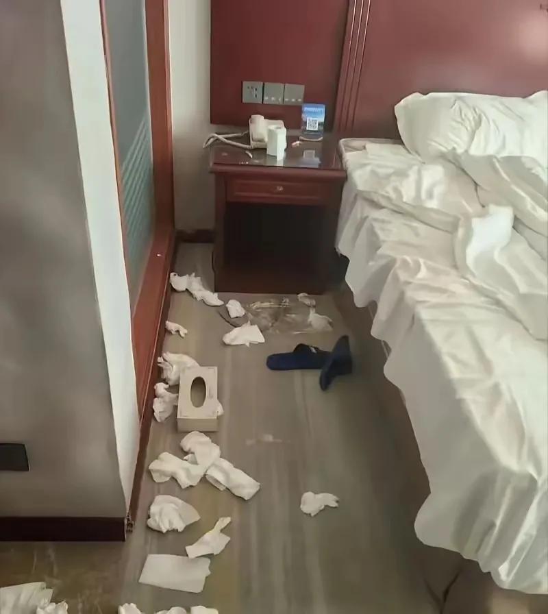打扫客卫卫生的阿姨也是心里套咕咕 三个小时的钟点房只住了两个小时后就退房离开了,这三男一女在两个小时前在入住的,怎么会把纸巾全部用光了,沈满地的纸巾乱扔一地,这样真的是太浪费了吧!是感冒了的话还不如去买点感冒药总比这个好,这个钟点房可要一百多呢!