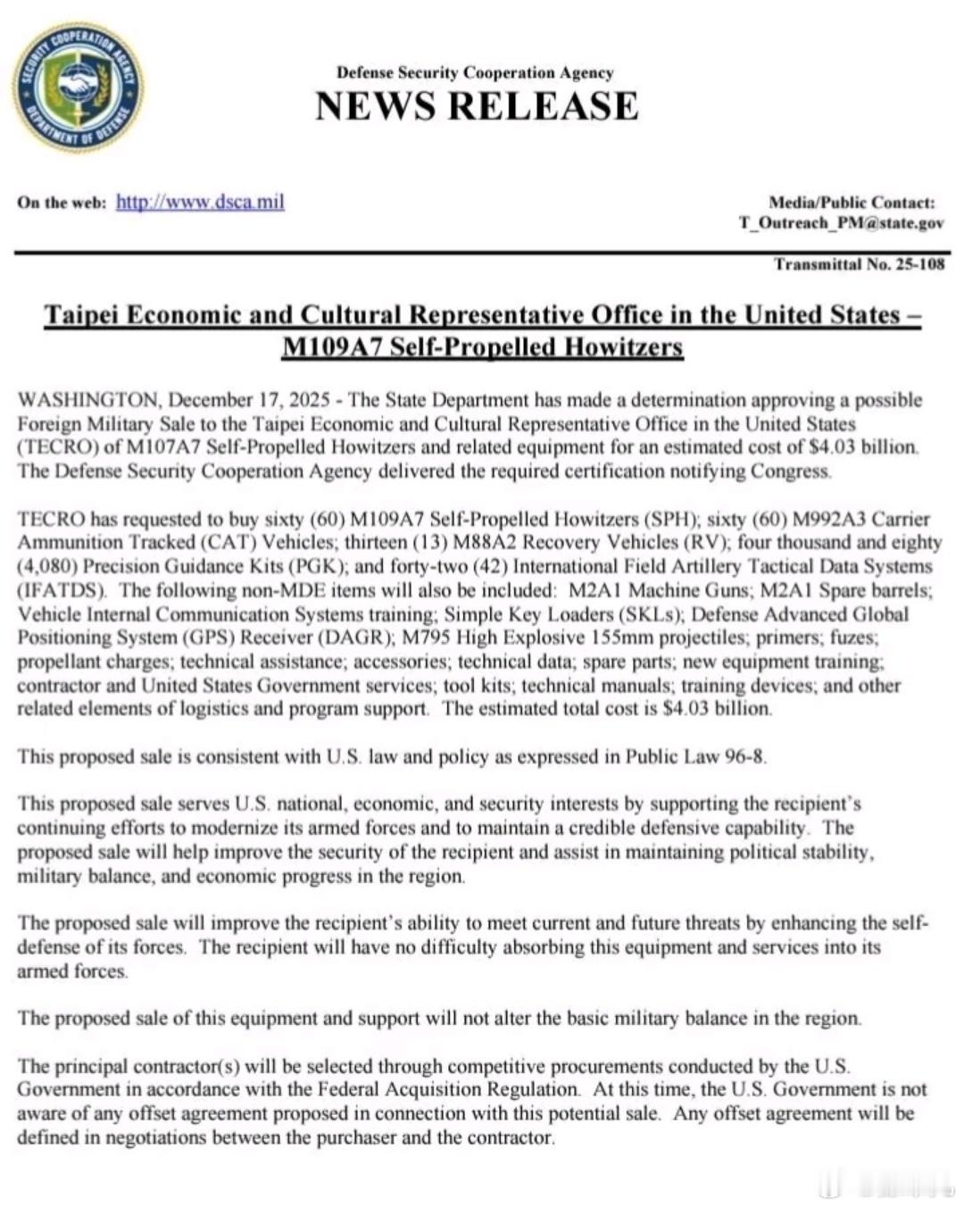 美国批准史上最大对台湾的武器出口。12月18日,美国国务院已批准8项新的对台军售,总价值估计约为110亿美元。此次批准的对台军售包括60辆M109A7型“帕拉丁”自行火炮、82辆“海马斯”多管火箭炮系统,以及420枚ATACMS陆军战术导弹。目前台湾已经装备了11辆“海马斯” ,加上第二批采购的82辆,总数将达到111辆。这是历史上最大规模的对台军售。该计划价值超过110亿美元,具体内容包括:- 美国武装部队战术任务网络(TMN)- 82套M142高机动性火箭炮系统(HIMARS)- 420套MGM-140陆军战术导弹系统(ATACMS)- 120门M109A7“帕拉丁”自行榴弹炮和M992A3弹药运输履带车- 1,545枚管式发射、光学跟踪、线导(TOW) 2B BGM-71F-7-RF导弹- 1,050枚FGM-148F“标枪”反坦克导弹- 鱼叉反舰导弹的导引头和维修- ALTIUS-600M 和 700M 巡飞弹系统AH-1W“超级眼镜蛇”攻击直升机的备件和维修零件。