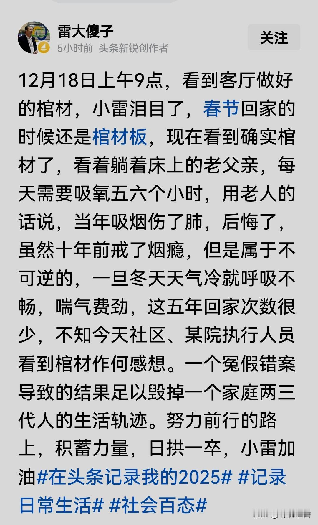 性格决定命运,虽然很多东奔西跑讨说法的人都是抱着不挣馒头挣口气的心理。但是,还是应该算算经济帐和家庭情感账,不要为了保住一粒芝麻却丢了一个西瓜,最后是赢了官司输了人生。 既然这次回家看到躺在床上的老父亲的身体状况,也看到了棺材放在了那里,还是在家多尽尽孝道吧!所以,仍然建议@雷大傻子 不要较真了,叫来叫去没有意义。
