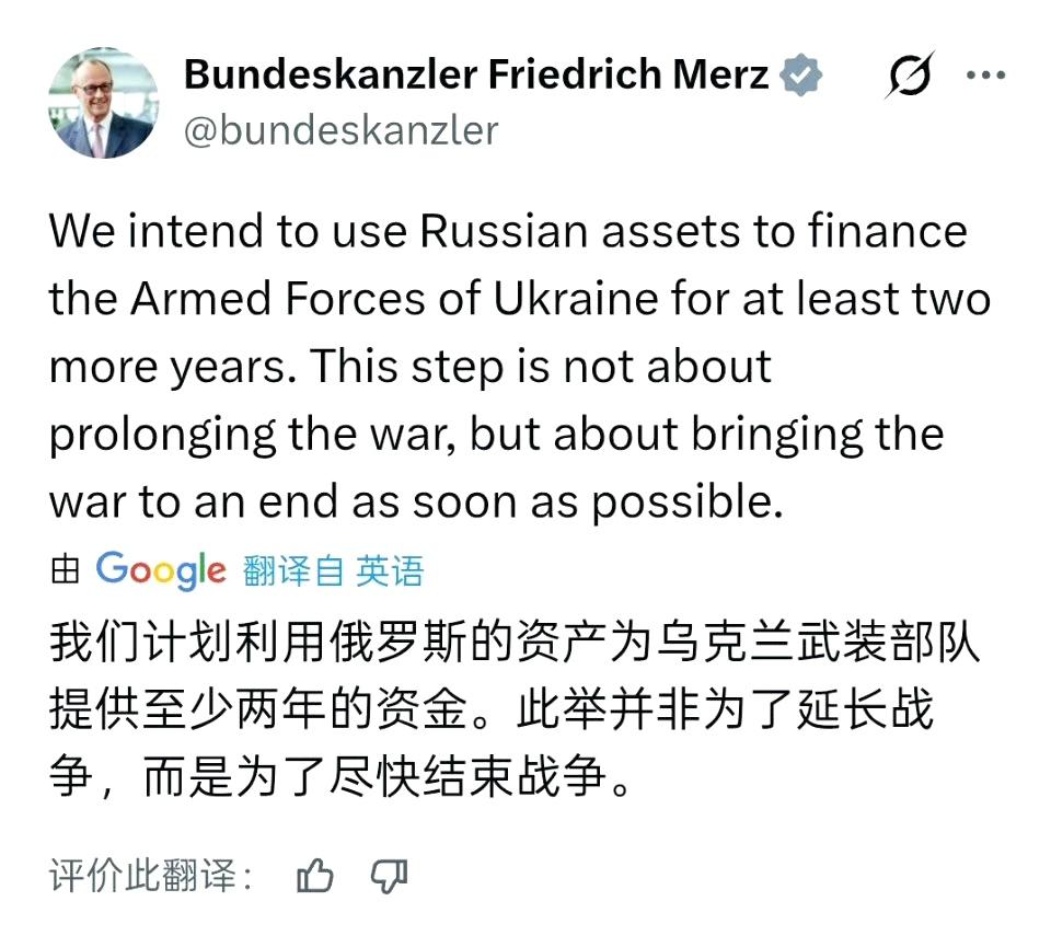 德国总理默茨计划利用俄罗斯的资产再资助乌克兰至少两年,声称是为了“尽快结束战争”。 再资助两年……为了尽快结束战争?有人能解释一下这逻辑吗?