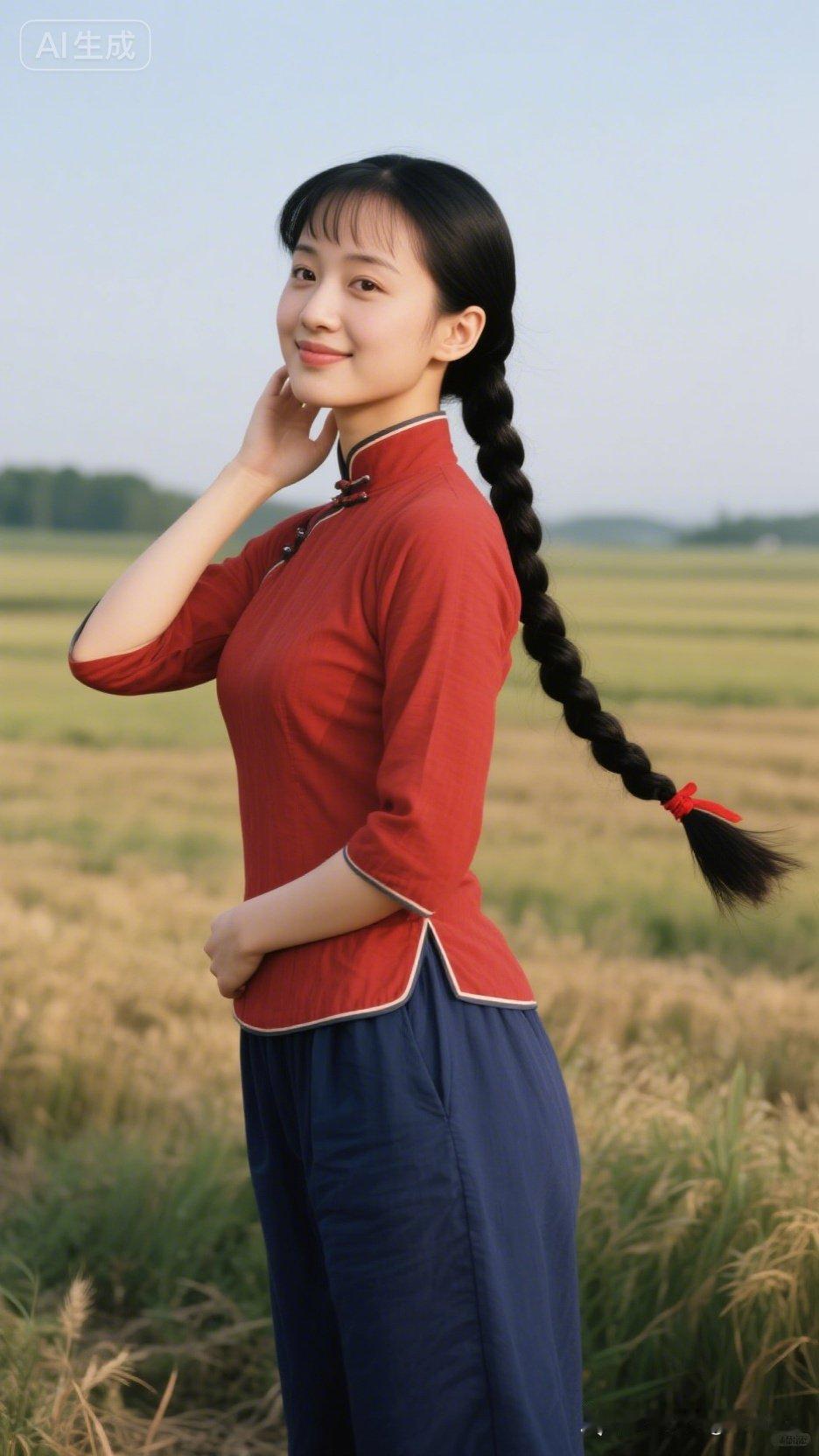 古风少女在田野中,红衣飘飘,笑靥如花。