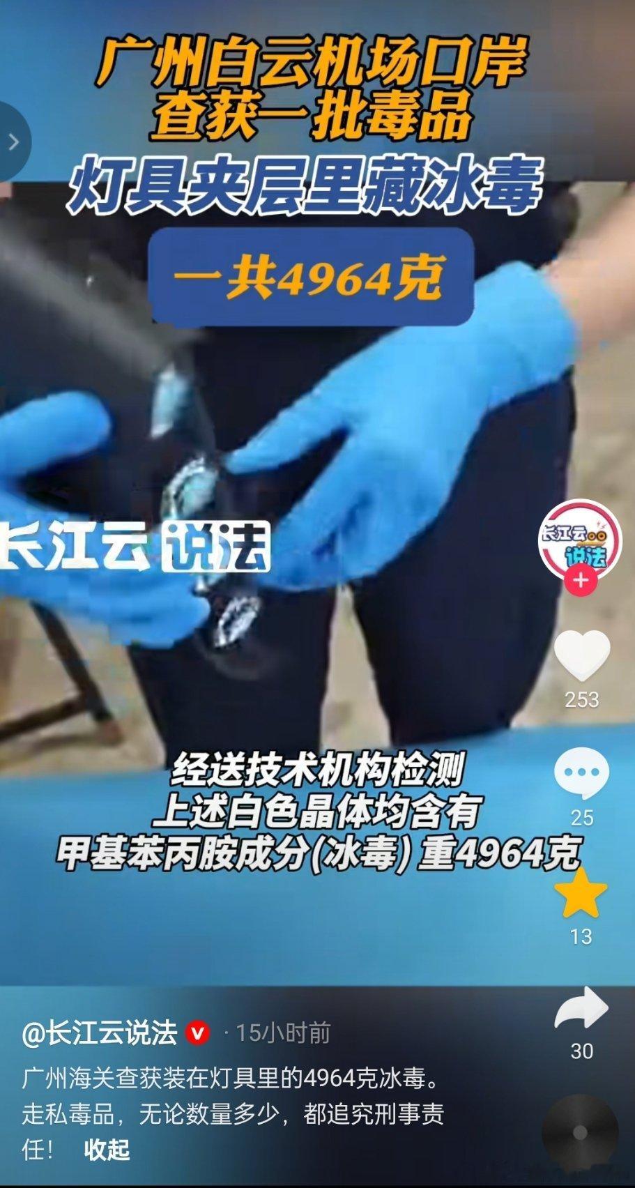 媒体:广州白云机场口岸,查获一批毒品,灯具夹层里藏冰毒,一共4964克。热点现场