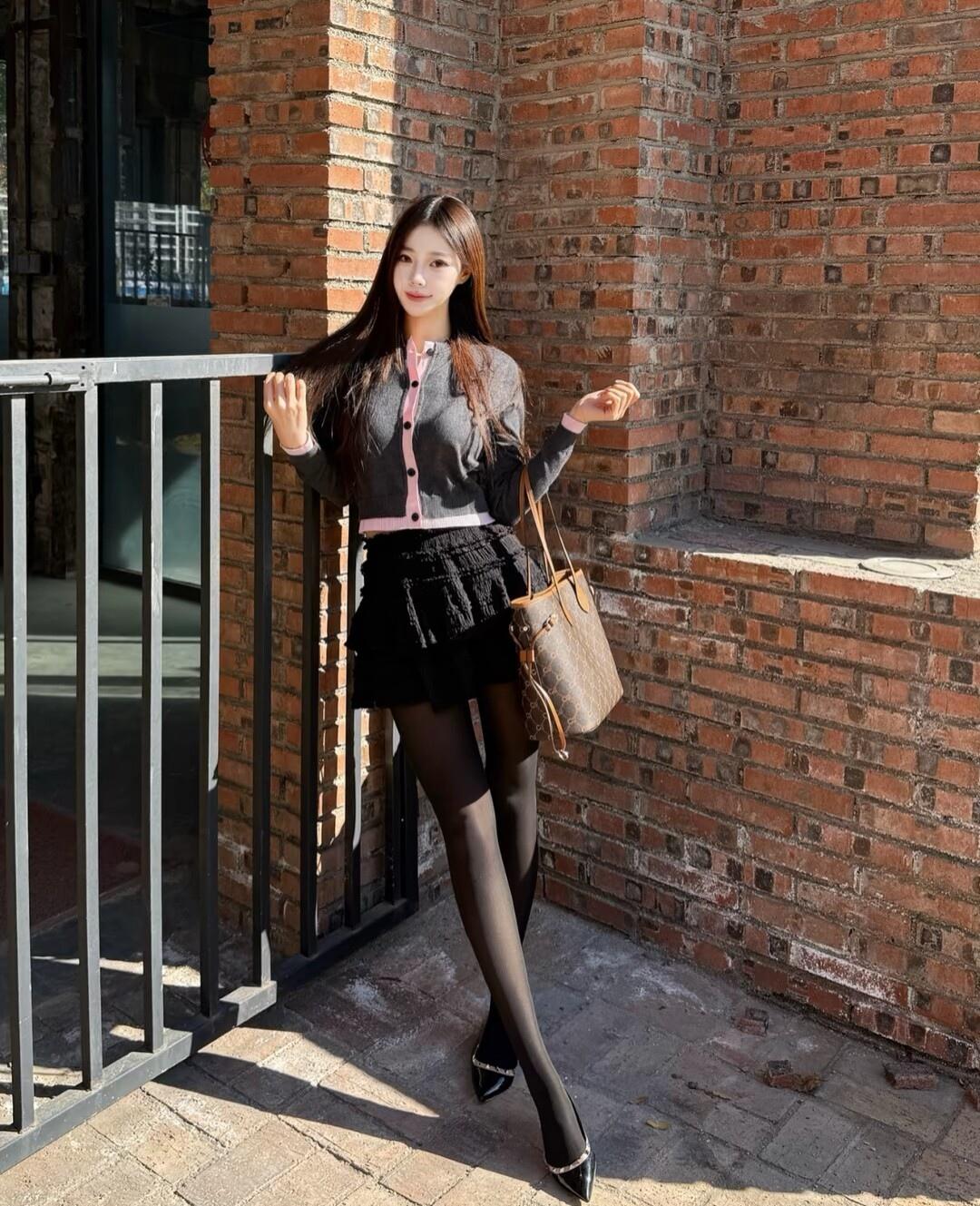 砖墙前的优雅少女,黑色短裙搭配灰色毛衣,手提包点缀,尽显都市风范!