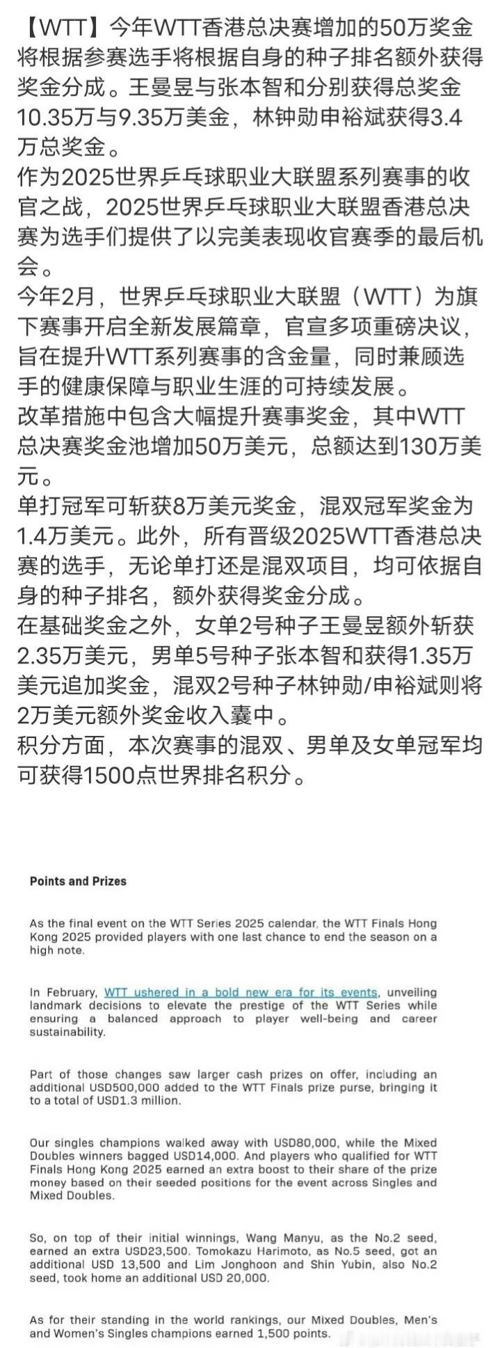 WTT大手笔啊,在基础奖金560万的基础上又追加了350万!王曼昱夺冠奖金由56万增加至72万了,张本智和,孙颖莎,王楚钦等都有一定程度的提升!WTT 王曼昱女乒夺冠