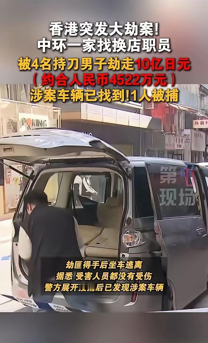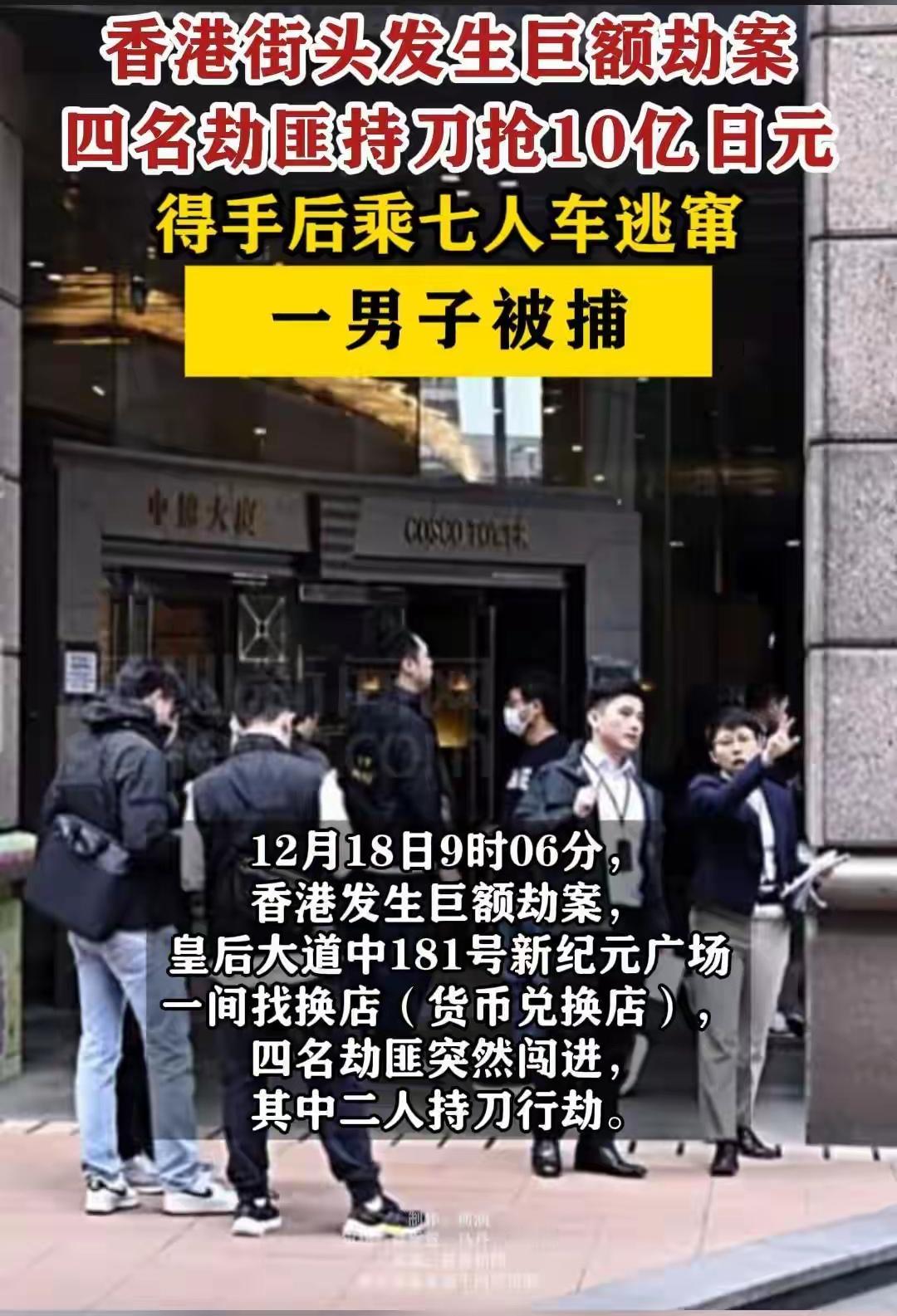 【4把刀、100公斤钞票、10亿日元——香港街头“搬砖式”抢劫?】 今天上午9点,香港上环街头出现“魔幻”一幕:四名男子持刀,从两名货币兑换店职员手中,抢走了整整10亿日元现钞。 你没看错,是10亿日元,相当于约4500万人民币。但更让人瞠目的是它的“分量”——全是面额1万的纸币,总重约100公斤,相当于一个成年壮汉的体重。被抢时,这些钱装在好几个行李箱里,职员正拖着它们去银行。 光天化日,在皇后大道中这样的繁华地段,劫匪想搬走这100公斤“钱砖”逃跑,场面实在有点“超现实”。难怪有网友调侃:这哪是抢劫,这是考验体力的“搬砖”业务啊! 案发后,警方反应迅速,已在附近拘捕一名涉案男子。但剩下的劫匪和那巨额现金去了哪?这桩离奇劫案背后,是单纯的暴力抢夺,还是另有隐情?