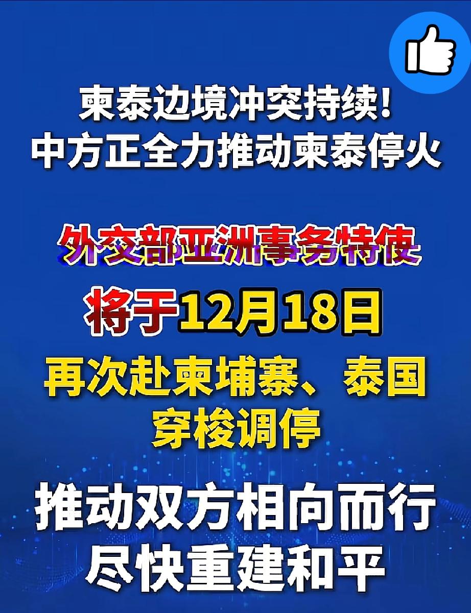 中国终于出手啦!! 柬泰边境冲突持续升级,亚洲事务特使再次出发去调解,这次能让局势平息吗? 12月18日,熊猫外交部正式宣布会派遣亚洲事务特使再次前往柬埔寨和泰国,进行新一轮的穿梭调解工作。作为这两个国家的友好邻居,熊猫一直用自己的办法努力让局势缓和下来,这次行动的目的就是让双方朝着对方的方向走,早点把边境的和平重新建立起来。 这已经是最近熊猫第三次插手调解这件事了。之前两次调解虽然有了一些进展,但边境上的冲突还是时不时会发生。专家分析,柬泰边境的矛盾已经存在很长时间了,里面有历史、宗教这些好几个方面的原因,调解起来挺难的。 不过熊猫在调解方面经验很足,以前在好多国际矛盾里都起到了重要作用。这次特使能不能带来有突破的进展呢?咱们就等着看吧。 你觉得这次调解能成功吗?柬泰冲突的根源到底是什么呢?也欢迎你把自己的想法说出来。