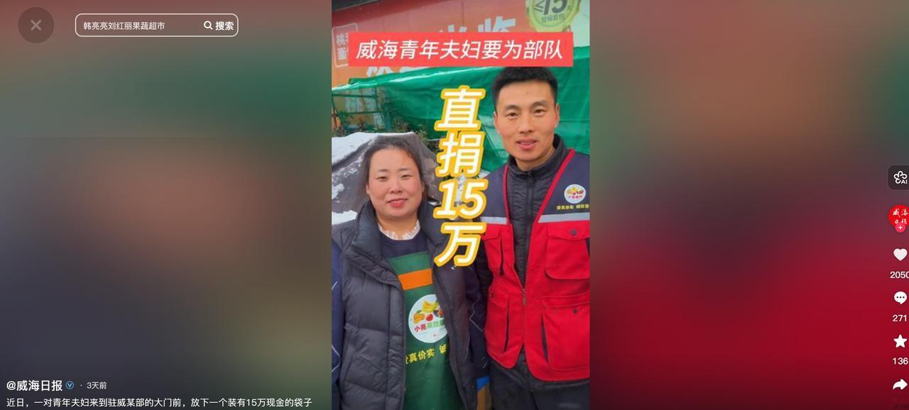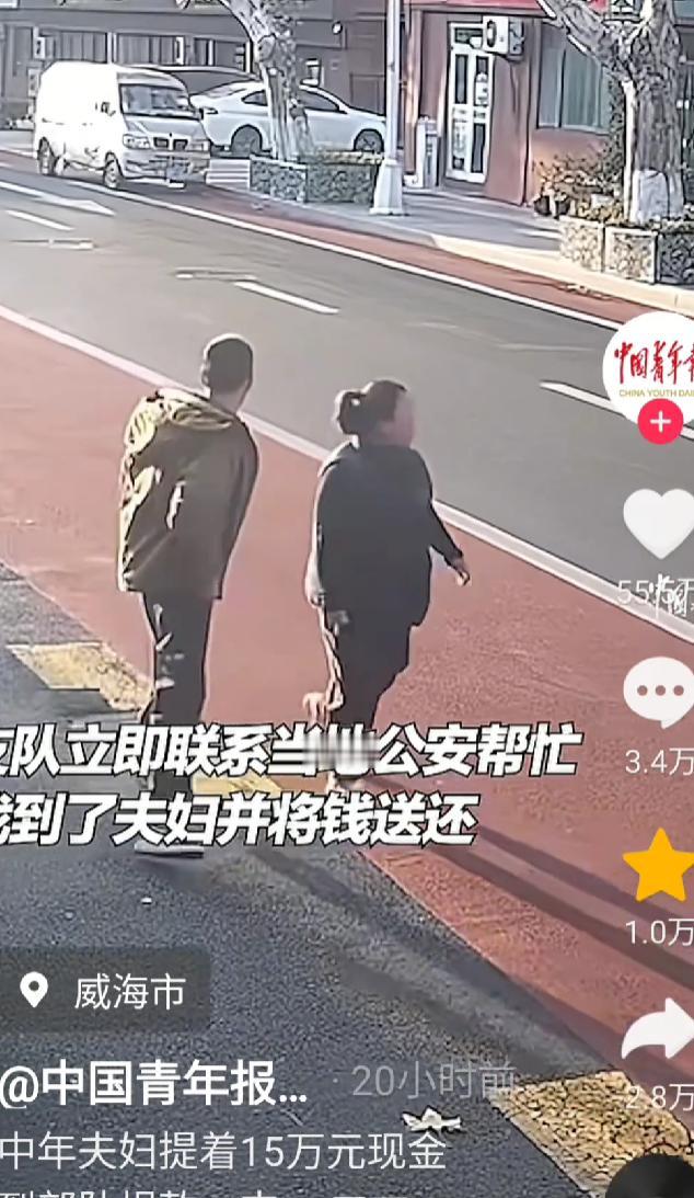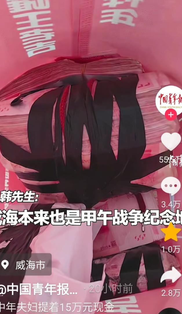 “这对夫妻火了!”山东威海,一对夫妻跑到北部战区海军某支队营区门口,干出了一件轰动全网的大事——他们提着15万现金,满心赤诚地前来部队捐款,只为支持国防建设! 在当地警方的见证下,北部战区海军某支队的官兵们将一沓沓现金郑重递回韩先生手中。这场持续数日的“寻主行动”终于有了结果,而故事的起点,是那个被哨兵捡起的、沉甸甸的黑色布袋。 那天清晨,营区门口的哨兵像往常一样执勤,一对中年夫妻曾带着布袋上前,脸上堆着诚恳的笑,说想给子弟兵送点“心意”。 “部队有规定,不能收群众的东西。”哨兵一边敬礼一边婉拒,夫妻俩没多说,只是点点头离开了,背影看起来有些失落。 谁也没想到,半小时后,这对夫妻又出现在营区另一侧的角落。 他们趁着哨兵换岗的间隙,突然快步上前,将布袋往门岗旁的台阶上一墩,喊了声“支持国防”,便转身跑开——丈夫跑得昂首挺胸,妻子的马尾辫随着脚步甩动,脸上是藏不住的骄傲,像完成了什么了不起的使命。 哨兵追了几步没追上,回来捡起布袋时才发现不对劲。 袋子比想象中沉得多,拉开拉链的瞬间,一捆捆红色钞票露了出来,数数竟有十五万! 这不是笔小数目。 官兵们心里又热又急:钱不能收是铁律,可夫妻俩没留姓名电话,人海茫茫,怎么还? 部队赶紧联系了辖区派出所,民警调取监控、走访周边商户,三天后找到了“肇事者”——韩先生和他爱人。 面对找上门的官兵和民警,韩先生有些不好意思,挠着头说,就是看新闻里子弟兵守卫海疆的样子,心里一动。 “更重要的是,我们住威海啊。”他指了指窗外,那里能看见远处的刘公岛,“甲午年的炮声,老一辈总挂在嘴边。” 威海的海风吹了百年,吹不散甲午战争的伤痕,也把“国防”两个字吹进了每个居民心里。 在韩先生看来,把钱交给守海疆的兵,就像给家里的门闩再加道锁,踏实。 没留名字,是不想让部队有压力,“就是普通老百姓,出点力是应该的。” 官兵们握着韩先生的手,说得眼眶发热:“我们守着威海,守着你们,这是职责。要是收了钱,那不成向群众伸手了?” 十五万现金原封不动还了回去,可夫妻俩转身跑开时的背影,却比钞票更有分量。 网友们刷到视频时,没人纠结钱退没退,都在说那夫妻俩的笑容——是那种“自家孩子有出息”的骄傲,是“家里有兵守着”的安心。 有人算了笔账,十五万对普通家庭意味着什么?可能是几年的积蓄,是孩子的学费,是老人的医药费。 可韩先生说“踏实”,这两个字,比任何数字都重。 威海的山海记得,百年前这里曾有过怎样的屈辱;威海的人也记得,如今的安宁,是因为有人把哨位站成了山。 这对夫妻没留下名字,却给所有人上了一课:爱国从来不是宏大的口号,是把日子过好的同时,心里装着海疆;是看着新闻里的子弟兵,想着“我能为他们做点啥”。 就像他们跑开时,阳光把背影拉得很长,那影子里,藏着每个中国人都懂的——国有防,家才安。