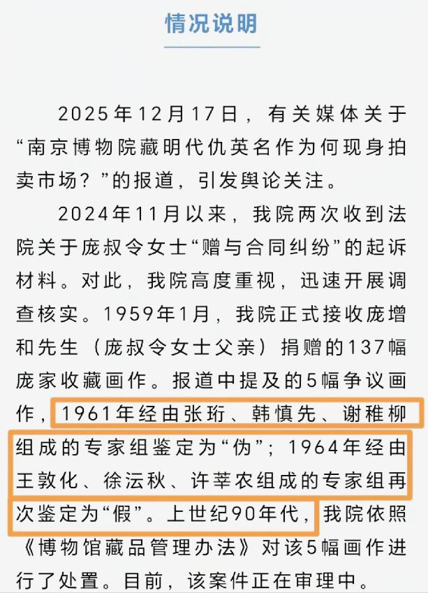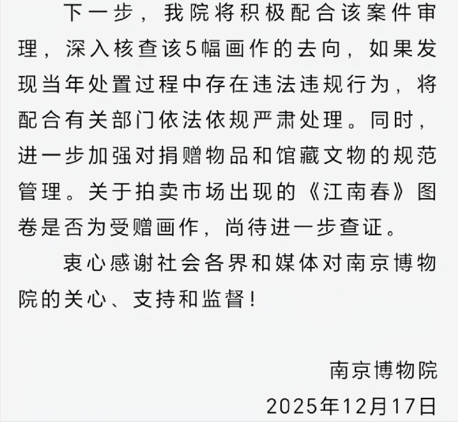 堂下何人,状告本官!南京博物院的馆藏品明代《江南春》图卷出现在了拍卖会上你们怎么看? 南京博物院历任院长: 第一任院长:蔡元培 1933年 第二任院长:傅斯年 1933年4月-1934年7月 第三任院长:李济 1934年7月-1947年5月 第四任院长:杭立武 1947年5月-1949年4月 第五任院长:徐平羽 1950年3月-1956年1月 第六任院长:曾昭燏 1956年1月-1964年12月 第七任院长:姚迁 1964年12月-1984年11月 第八任院长:梁白泉 1986年10月-1998年11月 第九任院长:徐湖平 2001年2月-2005年12月 第十任院长:龚良 2005年12月-2022年6月 第十一任院长:王奇志 2024年12月至今 如果是鉴定真品,那么就属于监守自盗,如果是伪作,拍卖会那就属于巨额欺诈。博物馆的东西应该好查吧,每件文物都要建立档案,入库,鉴定,编号,出库,修缮等等,都有严格的手续和程序,一查便知。 如果是真的话,这个级别的博物院尚且如此,那些知名的不知名的,大大小小的地方博物院会是个啥样子!