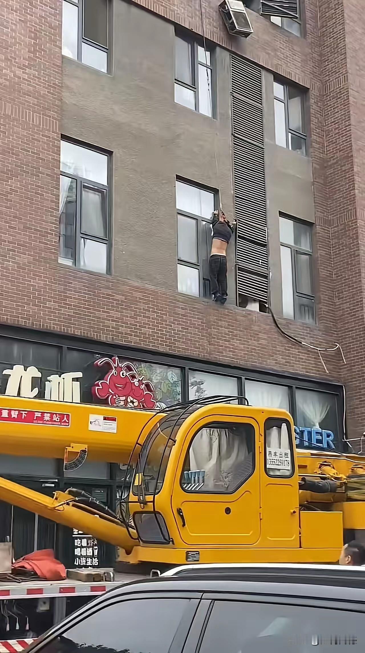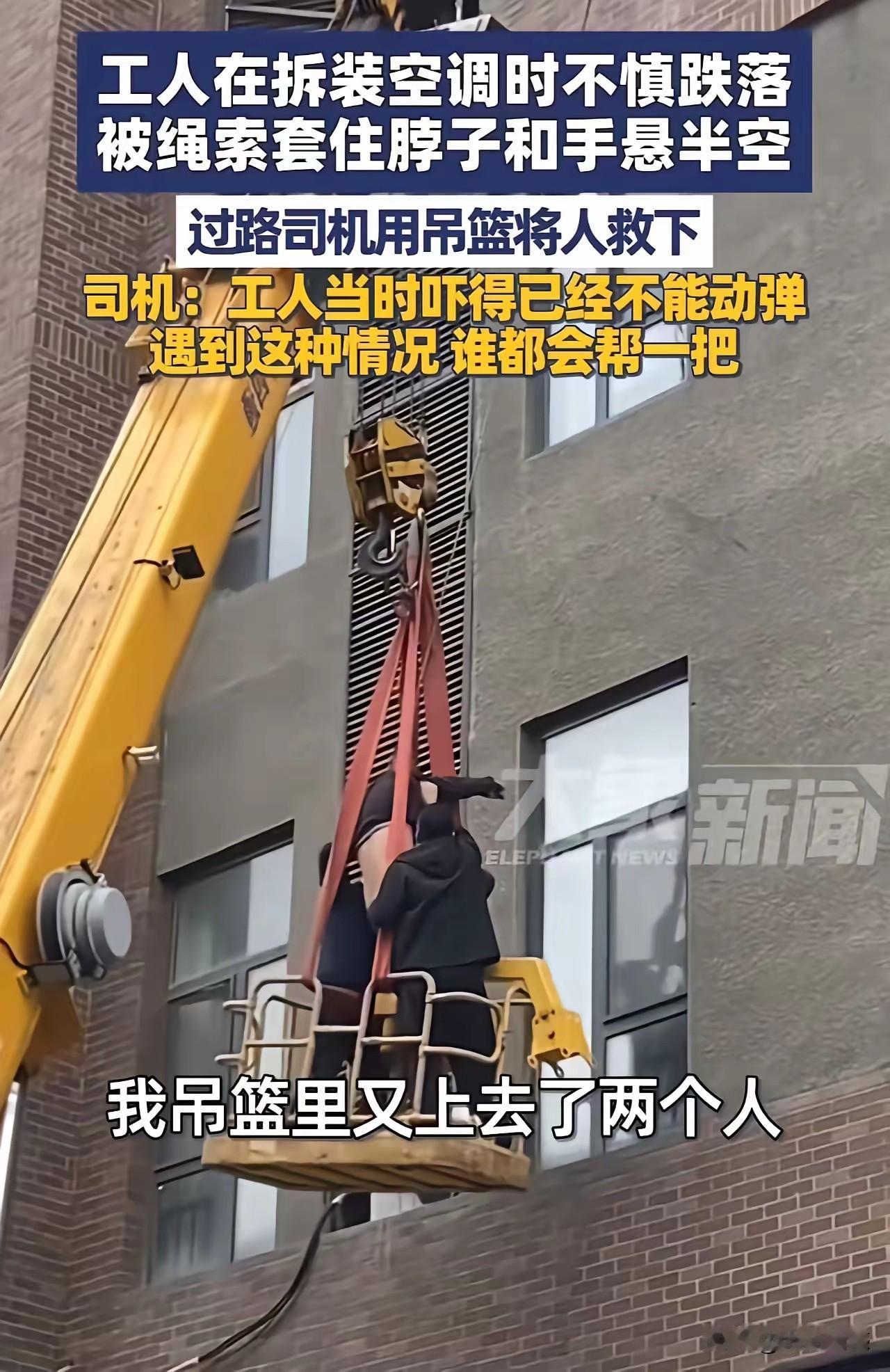 安装空调的工作人员真是太不容易了,高空作业充满了风险,画面中的这个工人,一不小心就从空中掉了下来,脖子被绳子套住了,多亏有路过的好心吊车司机和热心群众帮助,否则的话,后果不堪设想!为好心的吊车司机点赞,为热心群众点赞!