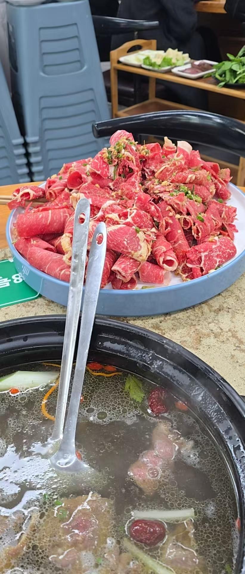 今天到昆明第一天,晚餐吃顿火锅没有羊肉,只有小黄牛肉120一公斤,蘸料没有麻将只有酸的和辣的调料,各种蔬菜非常绿色,人均消费100左右非常好吃。[呲牙]